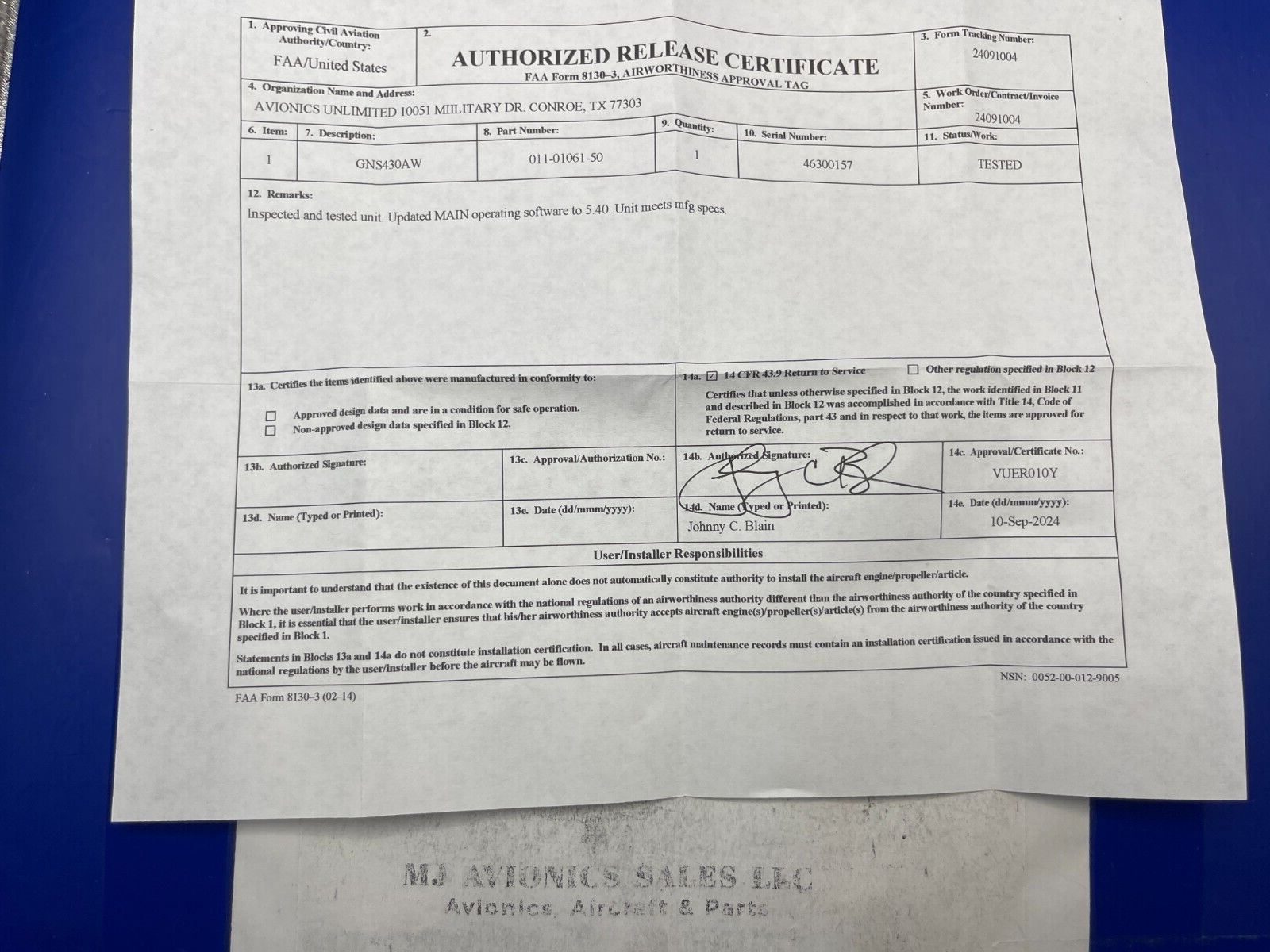 GARMIN GNS 430AW WAAS GPS/NAV/COMM 28 VDC P/N 011-01061-50 S/N 46300157.THIS UNIT WILL COME WITH FAA FORM 8130-3 DATED 09/10/2024 .COME WITH TRAY, BACKPLATE AND NAV DATA AND TERRAIN CARD