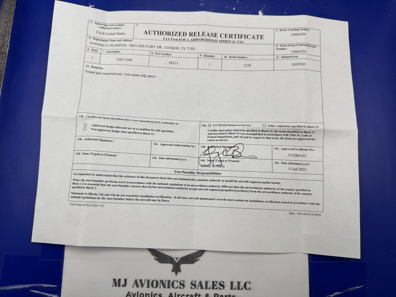 TKM MX11 P/N MX11 S/N 2339 COMM RADIO 14 VDC. COME WITH FAA FORM 8130-3 DATED 07/11/2025