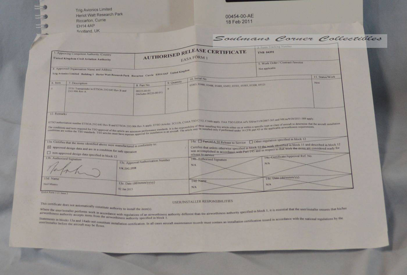 I DO NOT KNOW THE CONDITION, I only purchased it in a lot auction, but it comes with the install kit, manuals, and an EASA Form 1 from the United Kingdom Civil Aviation Authority.