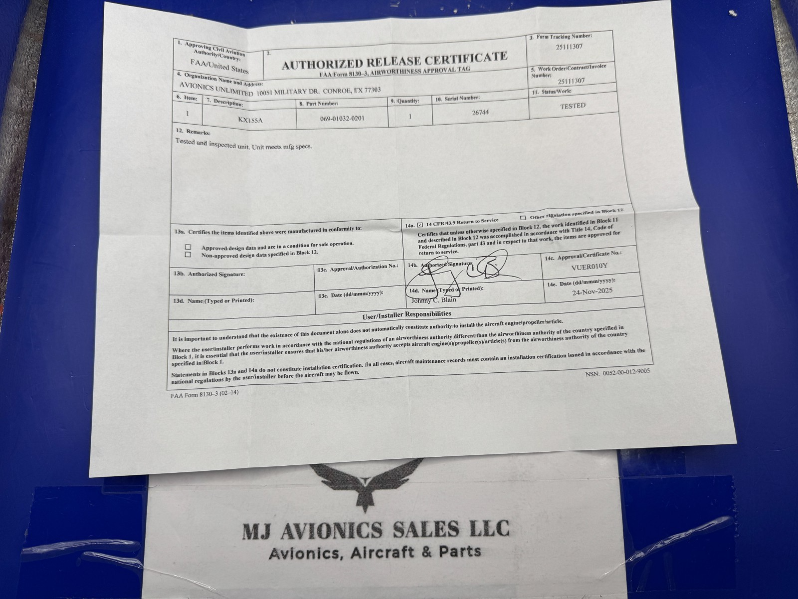 BENDIX/KING KX 155A 28 VDC P/N 069-01032-0201 S/N 26744 NON GLIDE/SLOPE COME WITH FAA FORM 8130-3 DATED 11/24/2025 THIS UNIT NEVER BEEN INSTALLED SINCE BEEN BENCH CHECK.