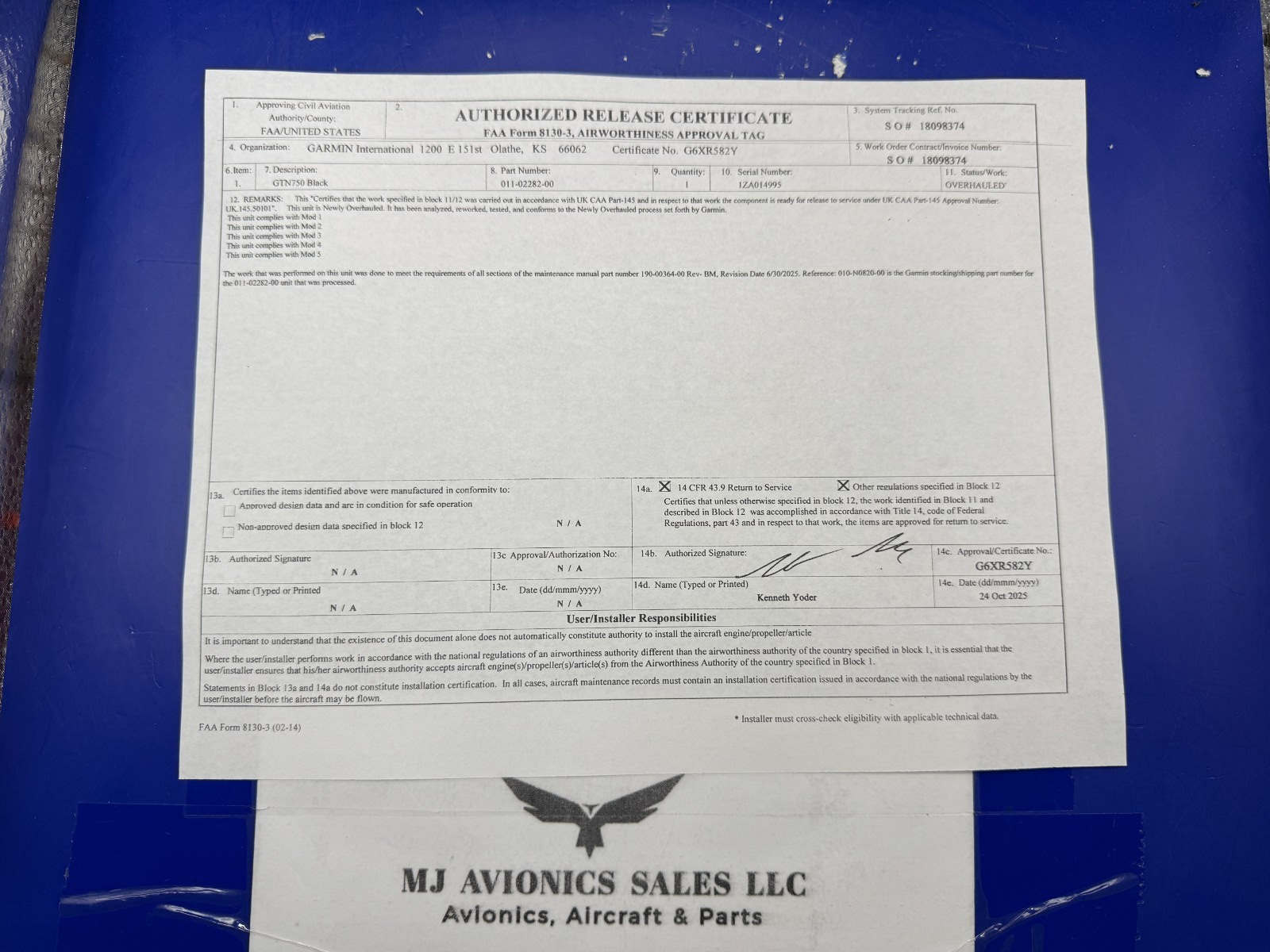 NEWLY OVERHAULED GARMIN GTN750 TOUCHSCREEN WAAS GPS/NAV/COMM P/N 011-02282-00 S/N 1ZA04995 WITH FAA FORM 8130 FROM GARMIN DATED 24/10/2025.COME WITH RACK, BACK PLATE,NEW INSTALLATION KIT