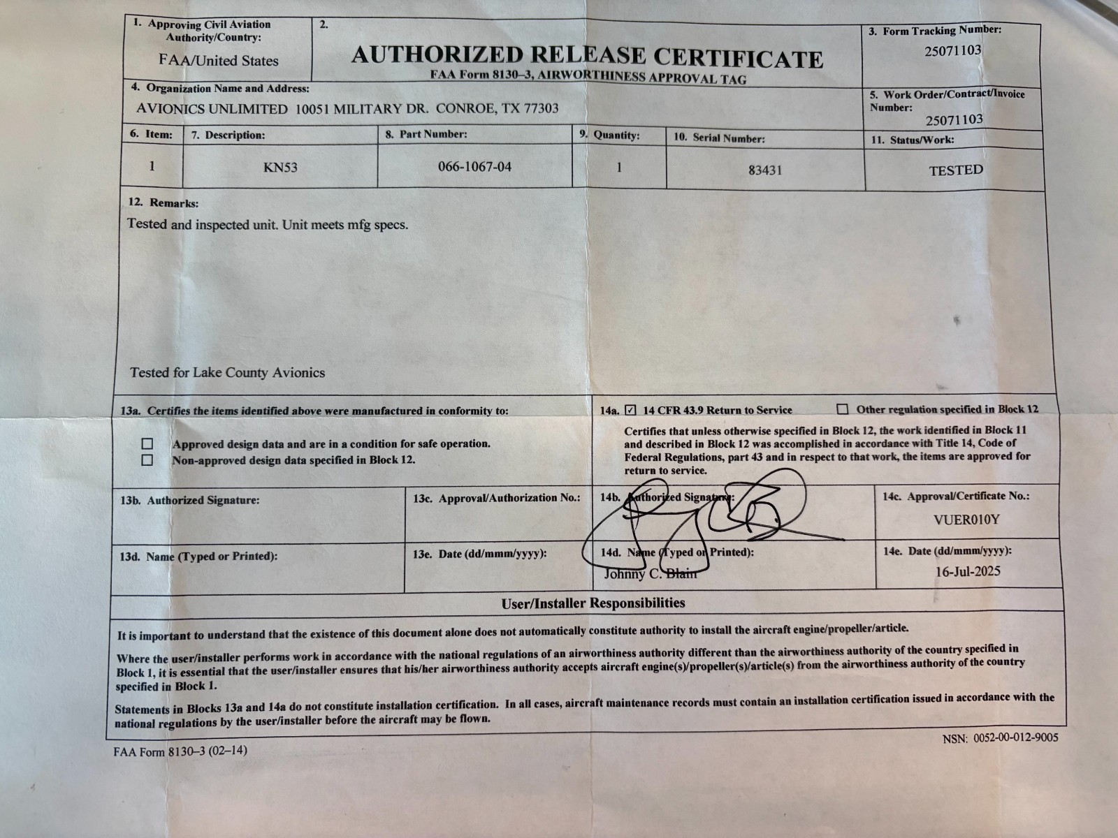 Navigation/Glideslope Receiver KN53 066-1067-04 w/ July 2025 Tested 8130