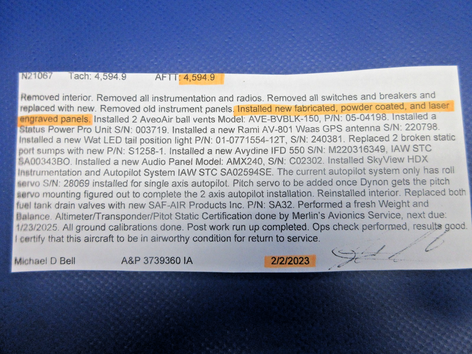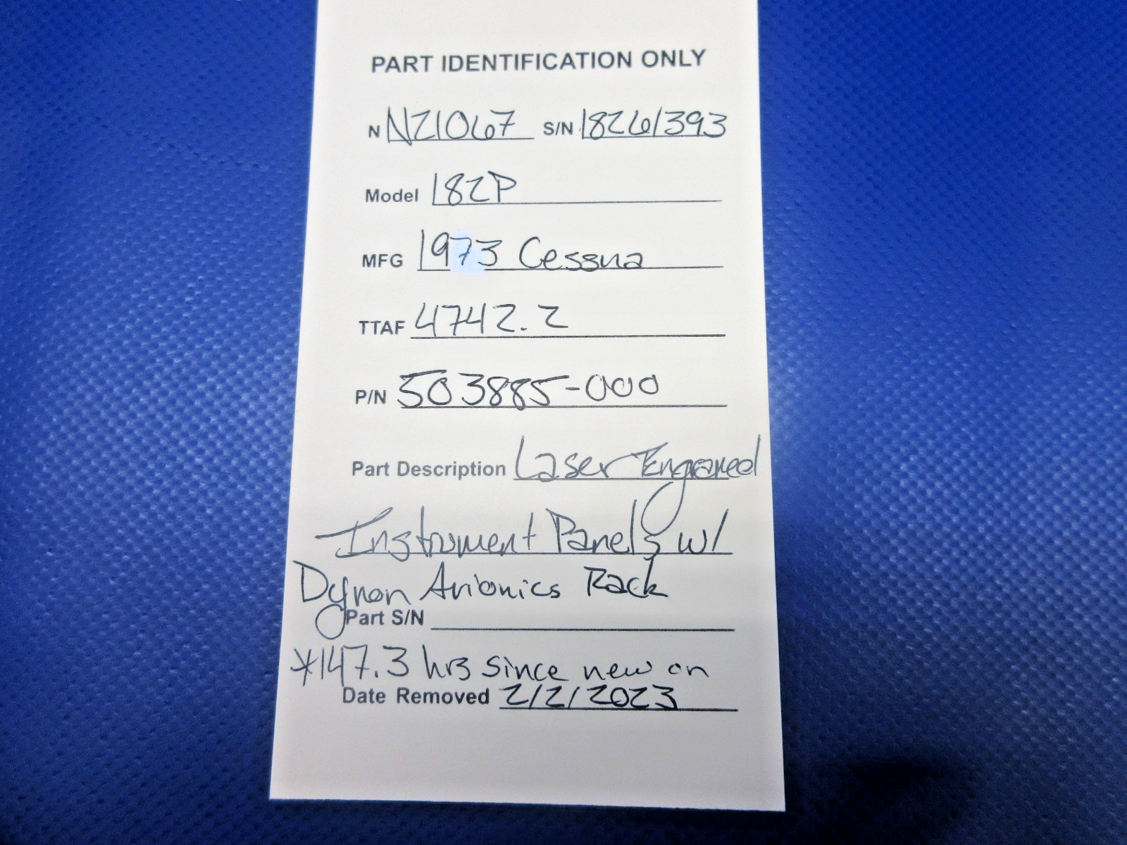 Cessna 182 / 182P Laser Engraved Instrument Panels With Dynon Rack. P/N 503885-000. 147.3 Hours Since new on 02/02/2023. Removed in good condition from a parted out 1972 Cessna 182P N21067, S/N 18261393. TTAF 4,742.2. Guaranteed to pass inspection or your money back.