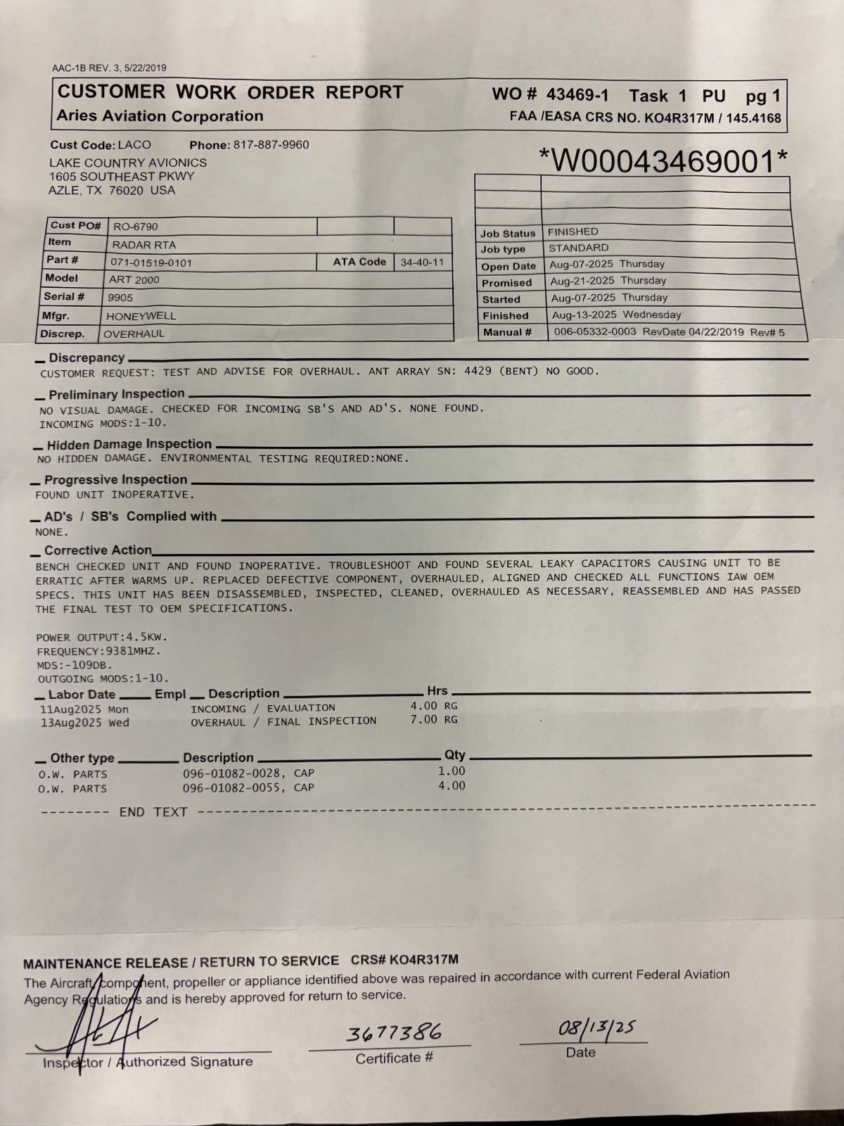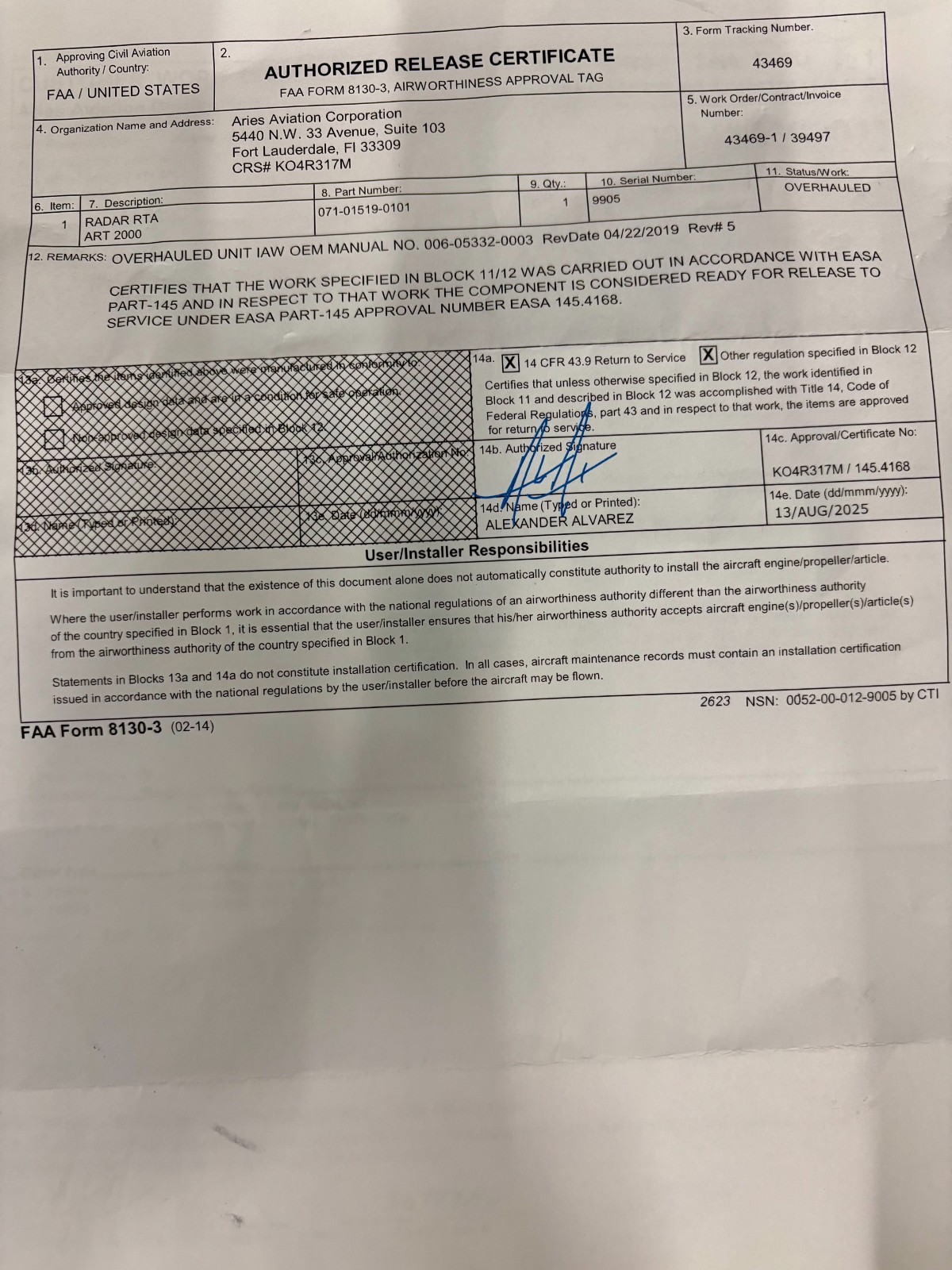 Digital Weather Radar ART2000 071-01519-0101 w/ August 2025 Overhauled 8130Click here to purchase or contact the seller of this item on eBay |