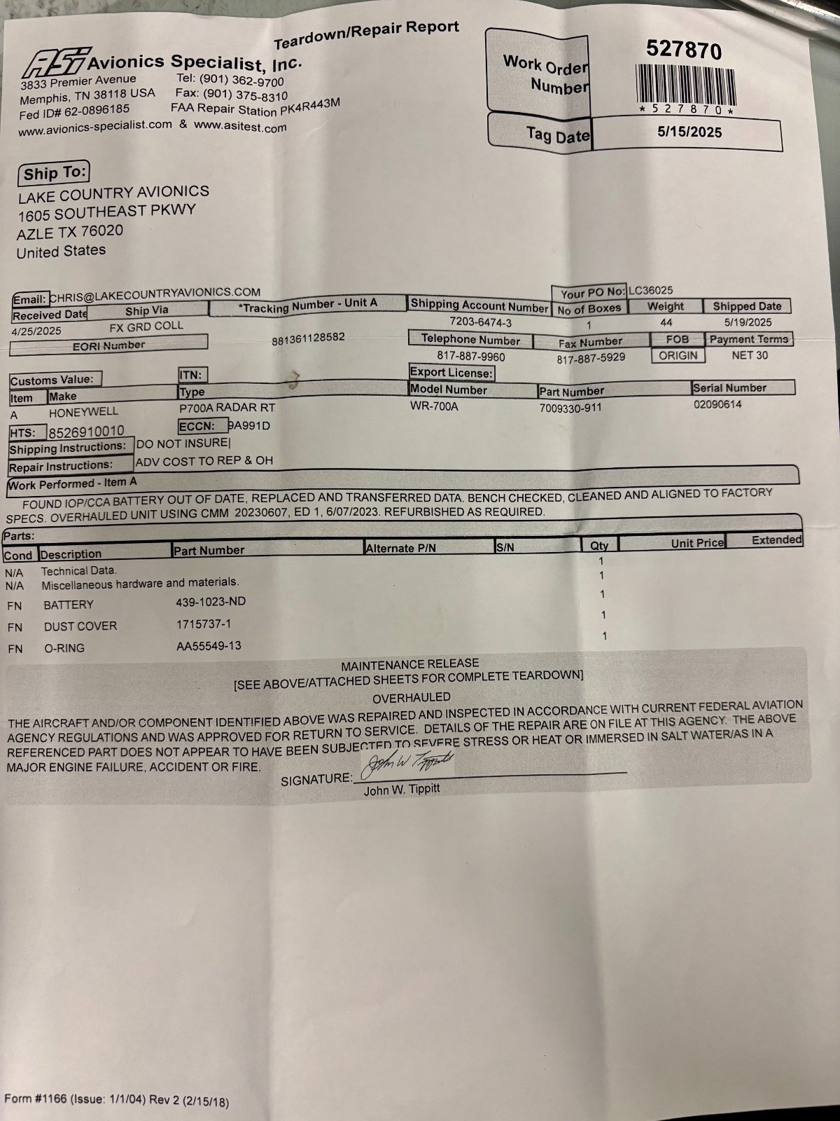 Radar RT WR700A 7009330-911 w/ May 2025 Overhauled 8130Click here to purchase or contact the seller of this item on eBay |
