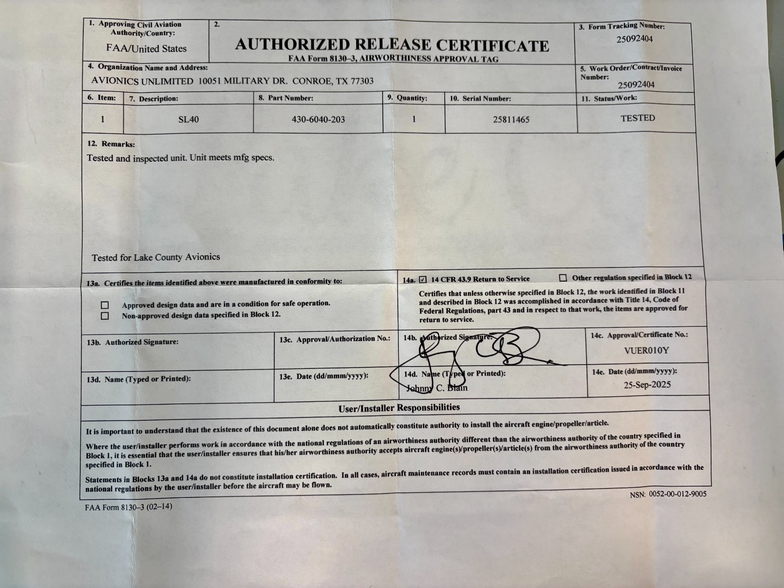VHF Comm SL40 430-6040-203 w/ September 2025 Tested 8130