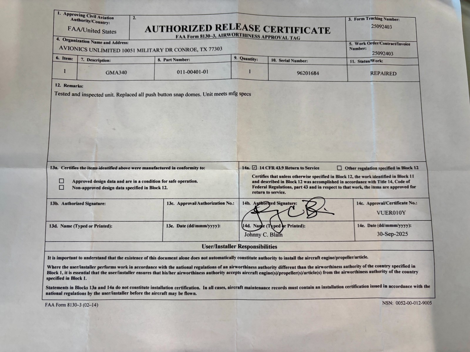 Audio Panel GMA340 011-00401-01 w/ September 2025 Repaired 8130