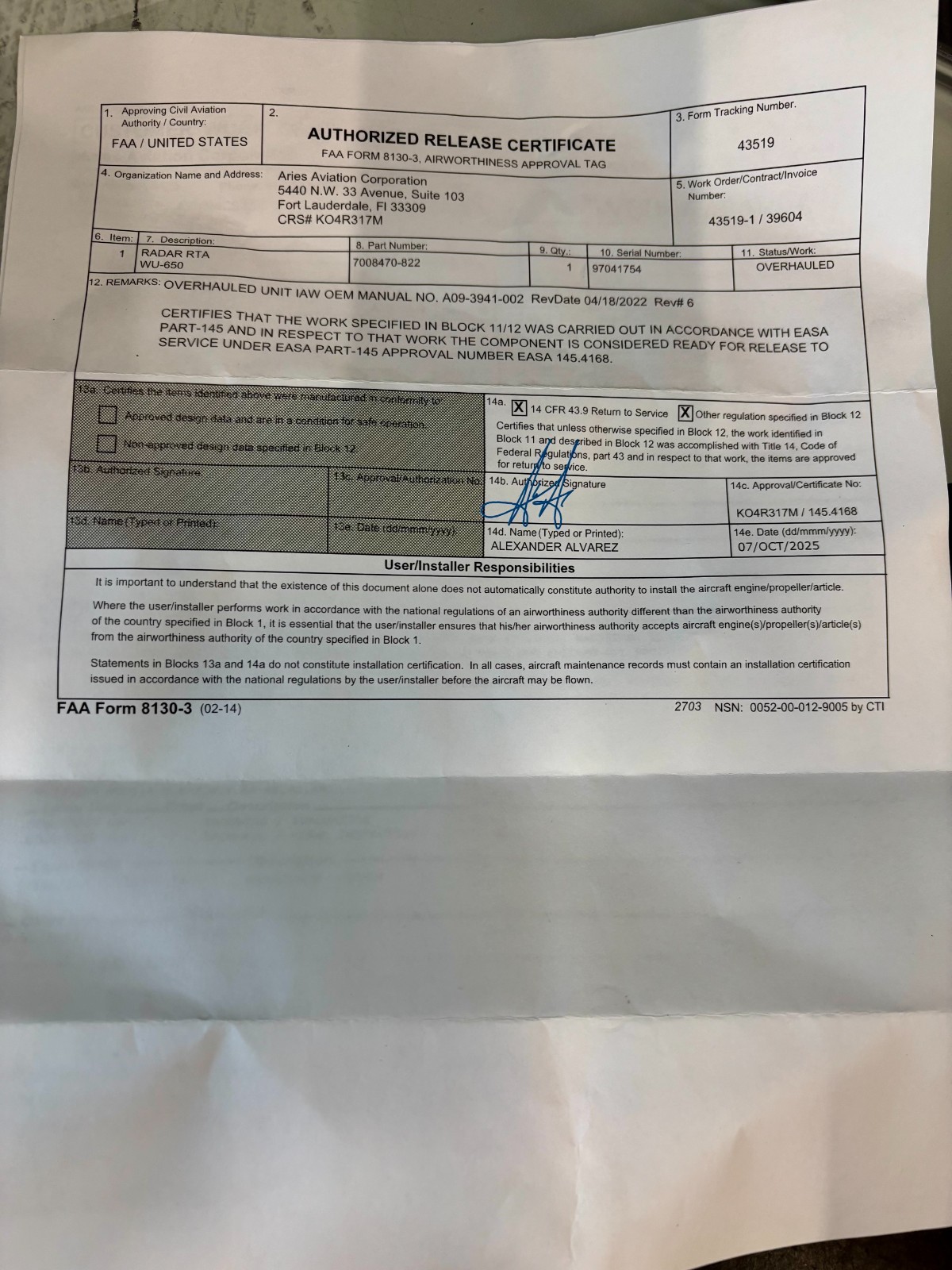 Radar RTA WU650 7008470-822 w/ October 2025 Overhauled 8130