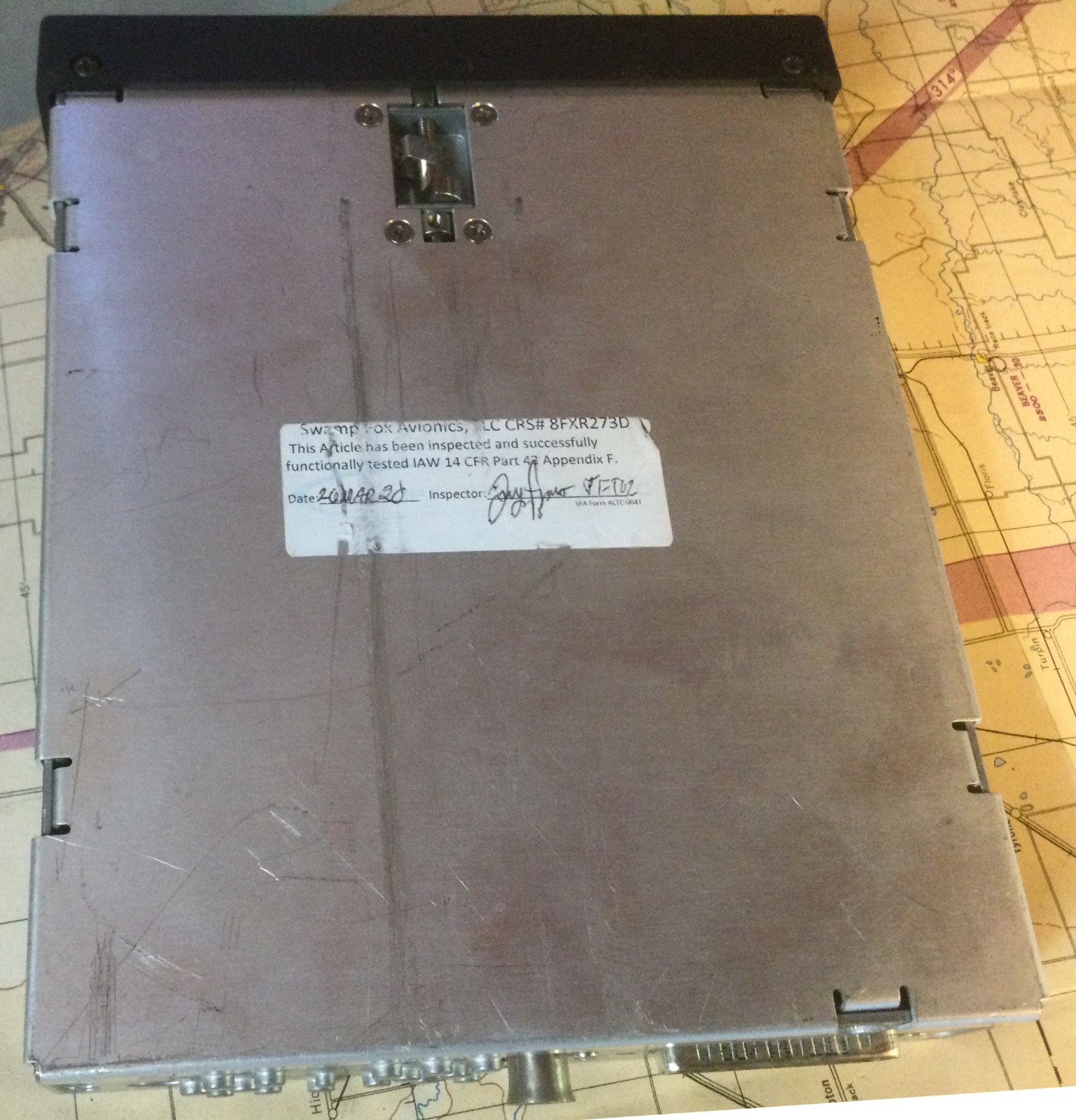 Unit is clean and complete, with intact display, buttons, and connectors. Includes label from SWAMP FOX Avionics showing prior functional test under 14 CFR Part 43 Appendix F (dated 2/4/20).