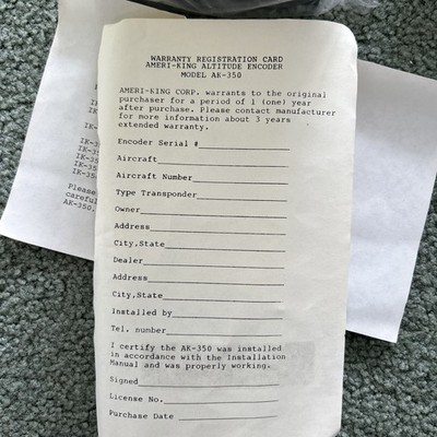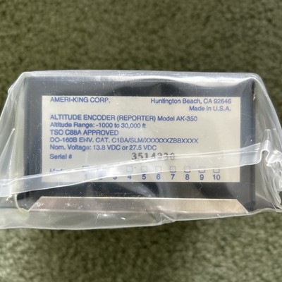 The NEW SEALED Ameri-King AK-350 Altitude Encoder is a high-quality aviation product manufactured by Ameri-King. This encoder is specifically designed for avionics systems, with a compatible make and model of AK350. With a 14/28 VDC power supply, this altitude encoder is a reliable and essential component for aircraft navigation and control systems.