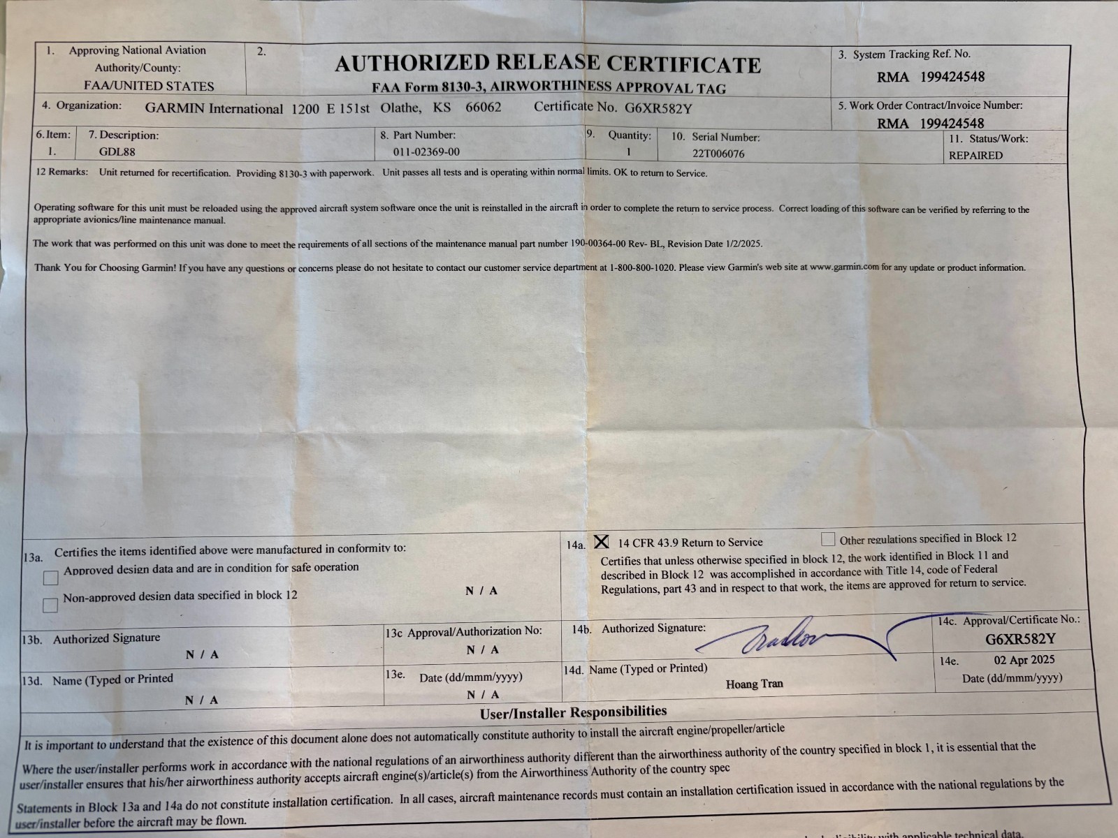 Garmin Transceiver GDL88 011-02369-00 w/ April 2025 Repaired 8130Click here to purchase or contact the seller of this item on eBay |