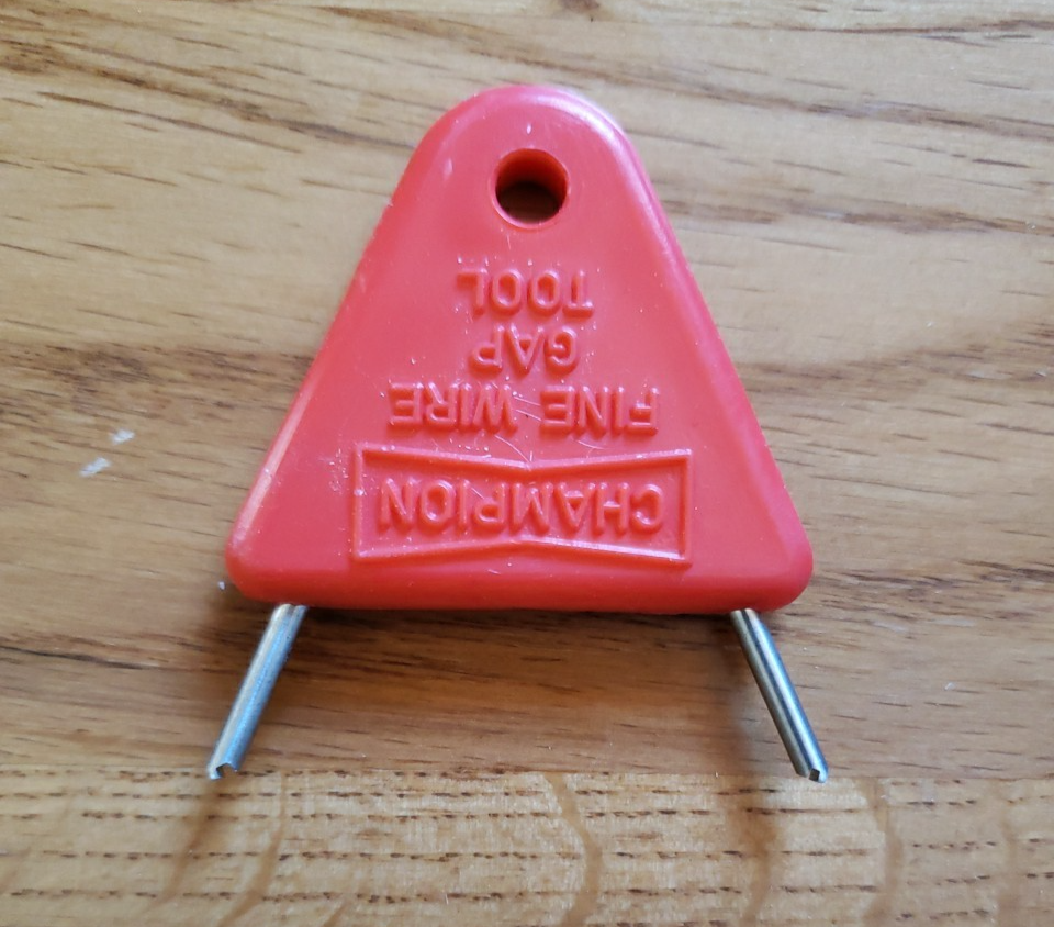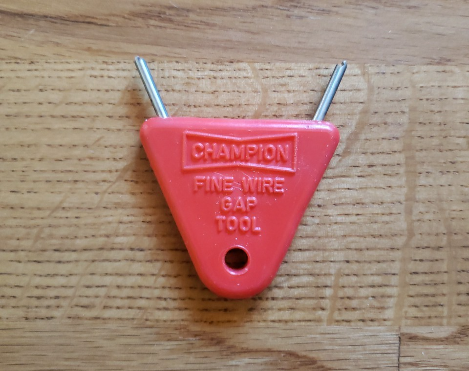 Champion CT-457 gapping tool for adjusting fine wire electrode spark plugs.