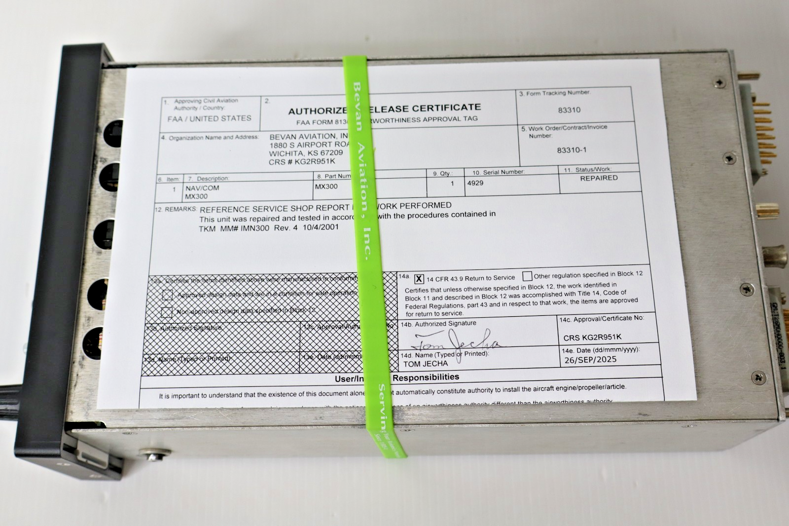 Unit has been serviced and repaired and comes with a fresh FAA 8130-3 Form (September 2025) along with 90-day warranty