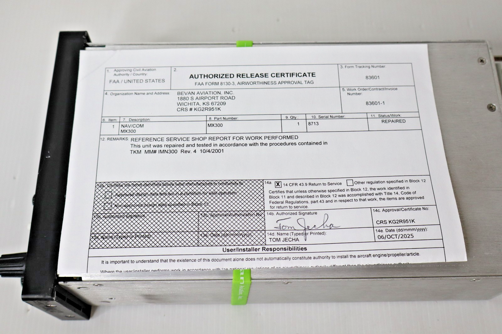 Unit has been serviced and repaired and comes with a fresh FAA 8130-3 Form (September 2025) along with 90-day warranty