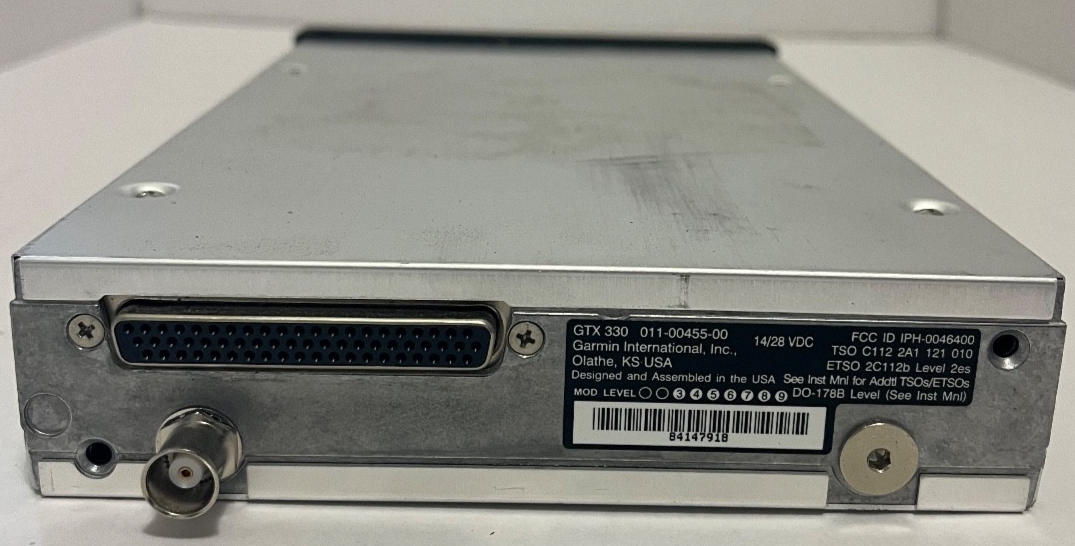 This GARMIN GTX330 was placed in our aircraft warehouse without any service tags to indicate operations. The unit looks fairly new and has mounting tray and connector (used). Outside of box states unit is good.
