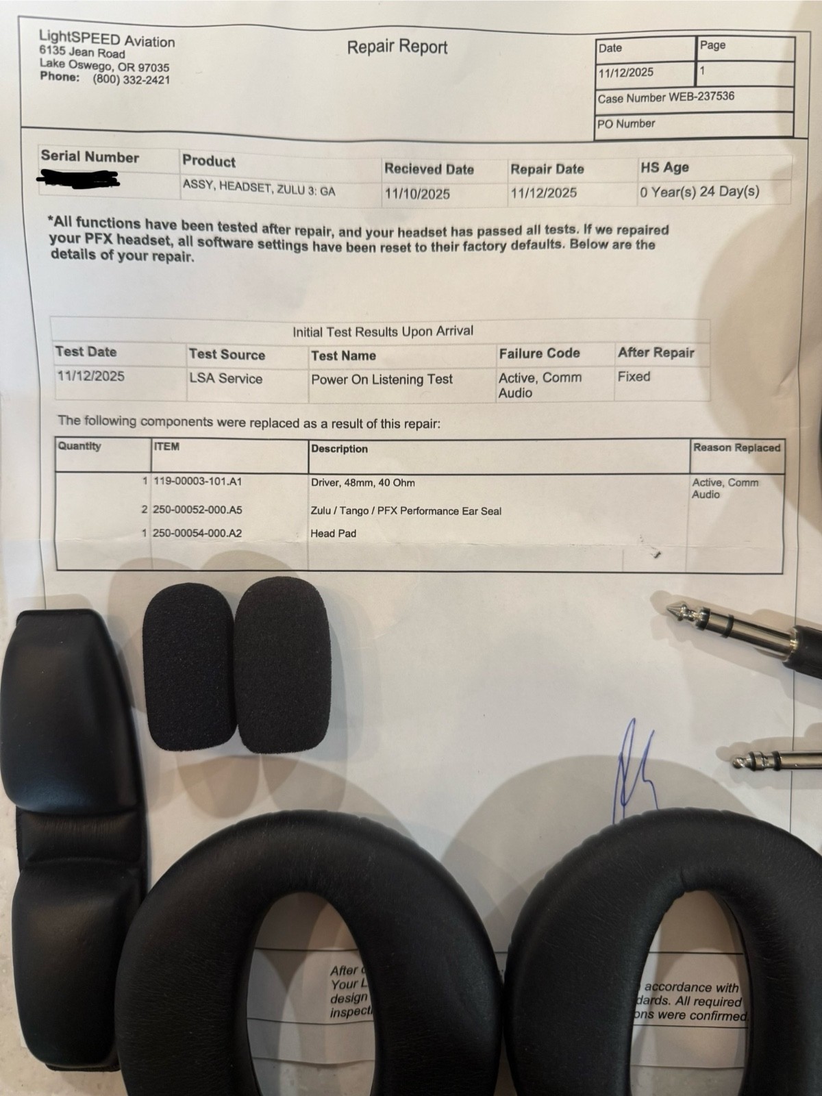 This is a Lightspeed Zulu 3 equipped with Dual Aviation Plugs that I sent in to the factory to be checked out and refurbished by Lightspeed before offering it up for sale. In the pictures you will see the invoice from Lightspeed indicating they did replace one of the earcup drivers that didn’t meet spec. As part of the refurbishment they replaced all the padding and mic muff. I am including 2 extra sets of lightly used ear cup seals, headband pad, and two extra mic muffs as we all know they have a way of disappearing. This headset is used but has been well taken care of despite some nicks and scratches. I used this headset through my cargo and regional pilot career and am switching to a different model that is compatible with the new aircraft I’ll be flying. I can say the Bluetooth feature works very well to play music or podcasts on those long boring flights to keep you entertained.