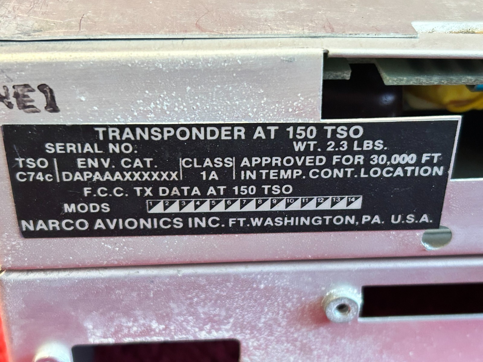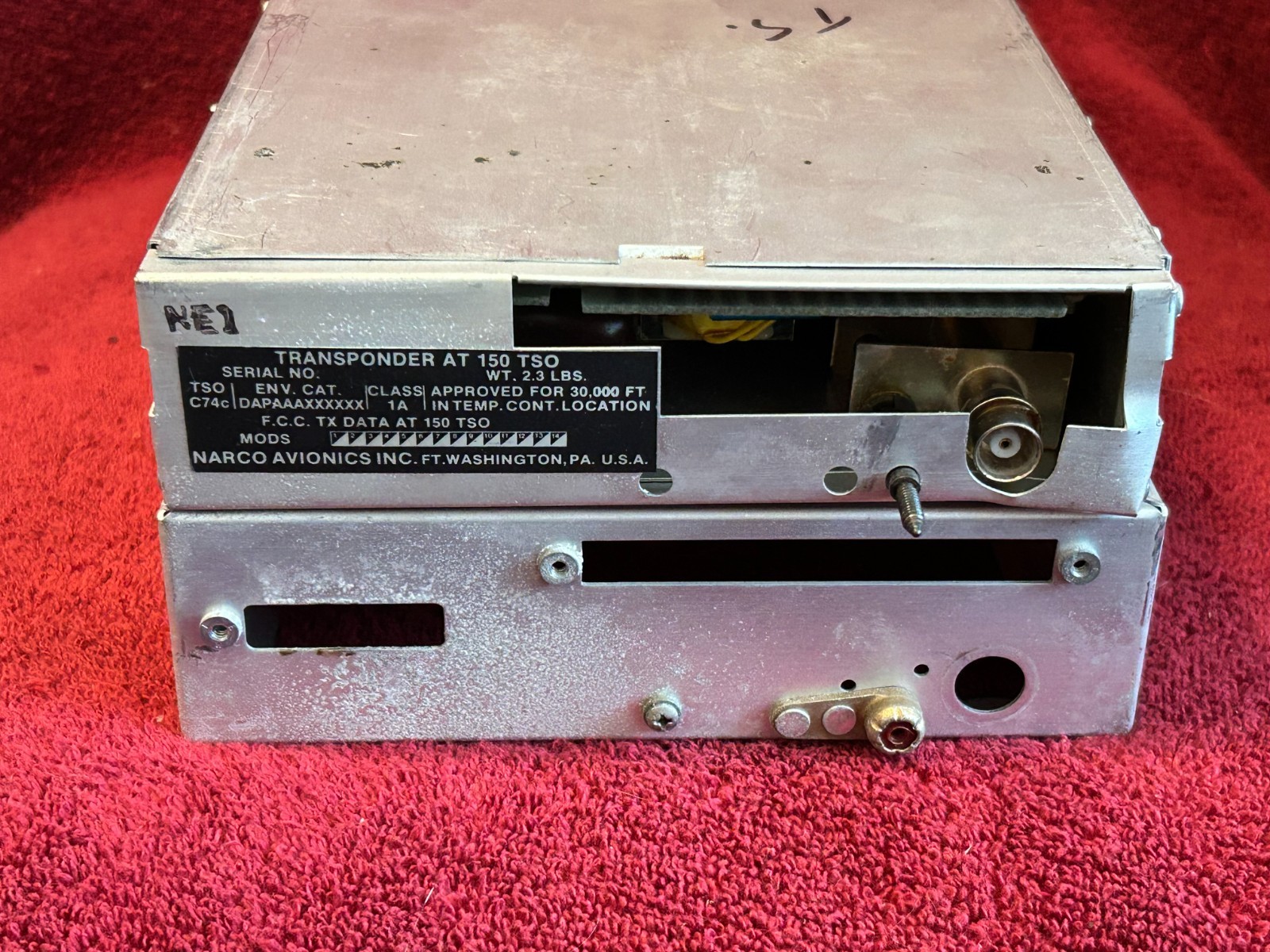 YOU ARE LOOKING AT A NARCO AT 150 TRANSPONDER WITH MOUNTING TRAY AVIONICS------WORKING WHEN REMOVED---FREE SHIPPING FOR U.S. MAINLAND STATES! ALASKA, PUERTO RICO, AND HAWAII PLEASE CONTACT SELLER AT AUCTION END FOR SHIPPING COST---------30-DAY MONEY BACK FROM PURCHASE DATE----- NO REFUND ON SHIPPING FEES. BUYER PAYS RETURN SHIPPING-------- WE SHIP WITHIN 1 BUSINESS DAY OF CLEARED PAYMENT. LOCAL PICK-UP ACCEPTED AS WELL---------------------WE OFFER COMBINED SHIPPING FOR MULTIPLE PURCHASES. HEAVIEST ITEM IS FULL PRICE, ALL OTHER ITEMS PURCHASED WILL BE CHARGED 50% OF THE ACTUAL SHIPPING COST AT AUCTION END-------------------