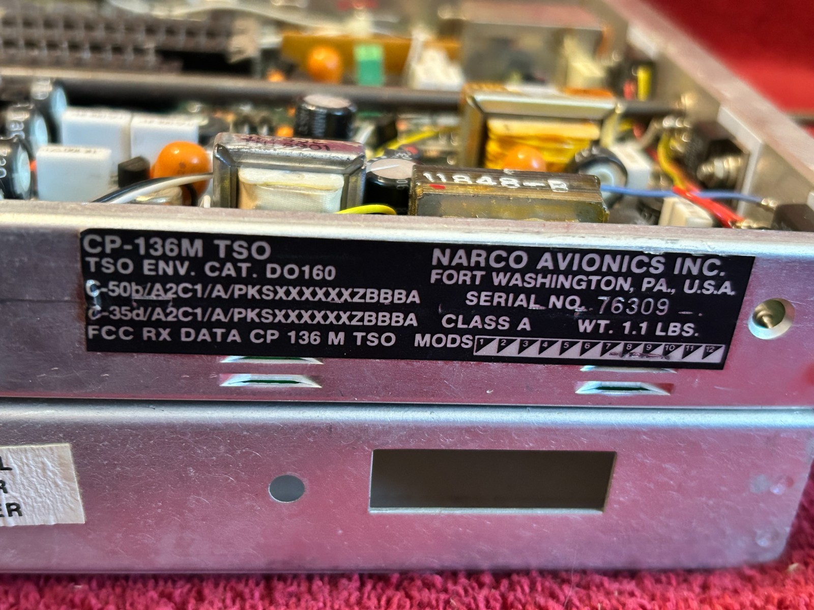 YOU ARE LOOKING AT A NARCO CP 136M AUDIO PANEL WITH MOUNTING TRAY---WORKING WHEN REMOVED -----------------S/N: 76309----- FREE SHIPPING FOR U.S. MAINLAND STATES! ALASKA, PUERTO RICO, AND HAWAII PLEASE CONTACT SELLER AT AUCTION END FOR SHIPPING COST------------30-DAY MONEY BACK FROM PURCHASE DATE . BUYER PAYS RETURN SHIPPING----------- WE SHIP WITHIN 1 BUSINESS DAY OF CLEARED PAYMENT. LOCAL PICK-UP ACCEPTED AS WELL---------------------WE OFFER COMBINED SHIPPING FOR MULTIPLE PURCHASES. HEAVIEST ITEM IS FULL PRICE, ALL OTHER ITEMS PURCHASED WILL BE CHARGED 50% OF THE ACTUAL SHIPPING COST AT AUCTION END------------------- INTERNATIONAL BUYERS PLEASE NOTE: IMPORT DUTIES, TAXES, AND CHARGES ARE NOT INCLUDED IN THE ITEM PRICE OR SHIPPING CHARGES. THESE CHARGES ARE THE BUYER’S RESPONSIBILITY. PLEASE CHECK WITH YOUR COUNTRY’S CUSTOMS OFFICE TO DETERMINE WHAT THESE ADDITIONAL COSTS WILL BE PRIOR TO BIDDING/BUYING. THESE CHARGES ARE NORMALLY COLLECTED BY THE DELIVERING FREIGHT (SHIPPING) COMPANY OR WHEN YOU PICK THE ITEM UP-PLEASE DO NOT CONFUSE THEM FOR ADDITIONAL SHIPPING CHARGES.--------------- WE DO NOT MARK MERCHANDISE VALUES BELOW VALUE OR MARK ITEMS AS “GIFTS”-U.S. AND INTERNATIONAL GOVERNMENT REGULATIONS PROHIBIT SUCH BEHAVIOR.--------------- ALSO, INTERNATIONAL BUYERS PLEASE SUBMIT COMPLETE SHIPPING INFORMATION INCLUDING A TELEPHONE NUMBER.--------------- WE ACCEPT PAYPAL AS FORM OF PAYMENT.------------------- PAYMENT MUST BE COMPLETED WITHIN 7 DAYS OF AUCTION END OR SELLER HAS THE RIGHT TO RELIST OR SELL ITEM TO SOMEONE ELSE AND UNPAID ITEM DISPUTE WILL BE FILED.---------------- THANK YOU FOR LOOKING AND PLEASE