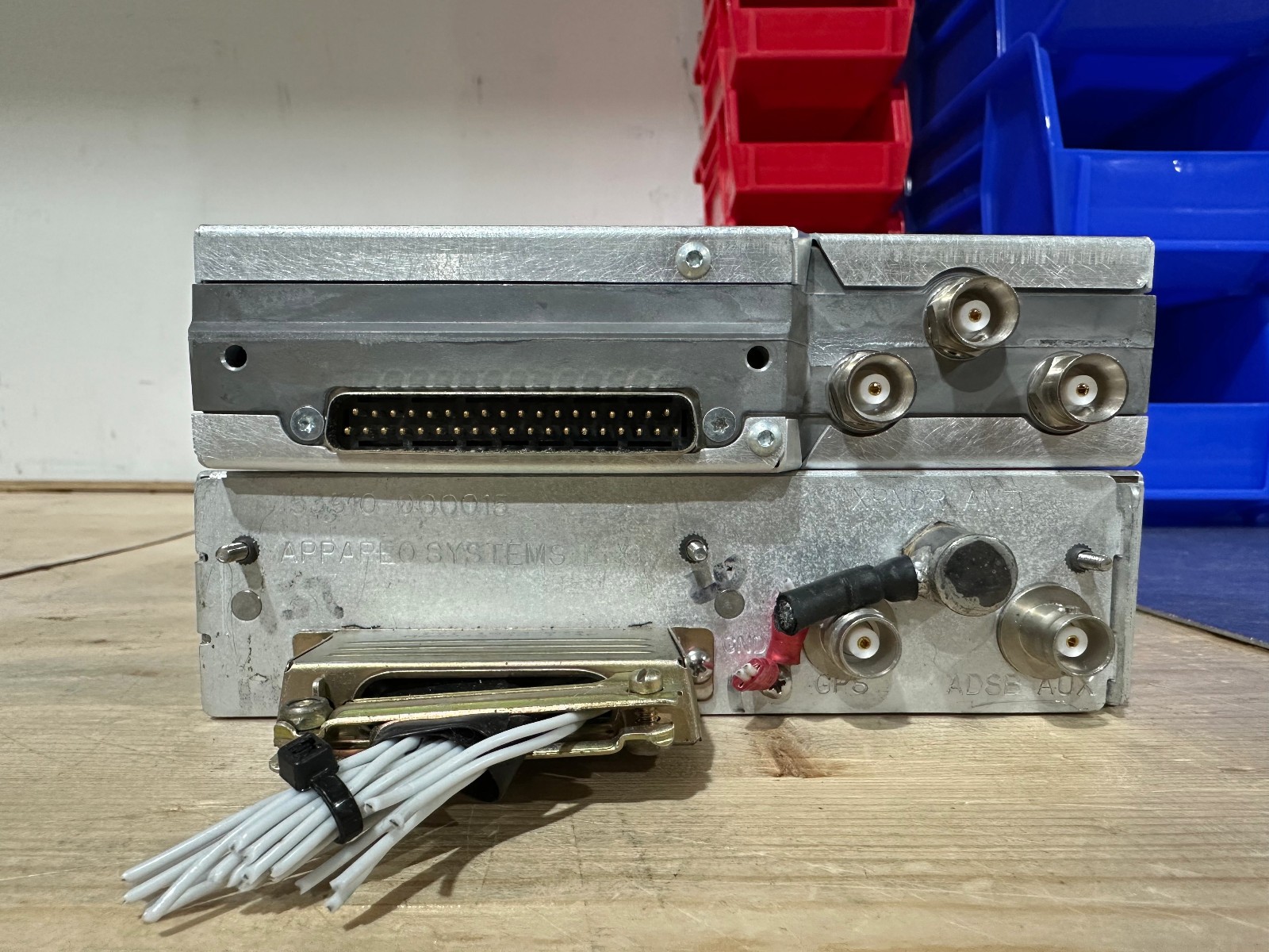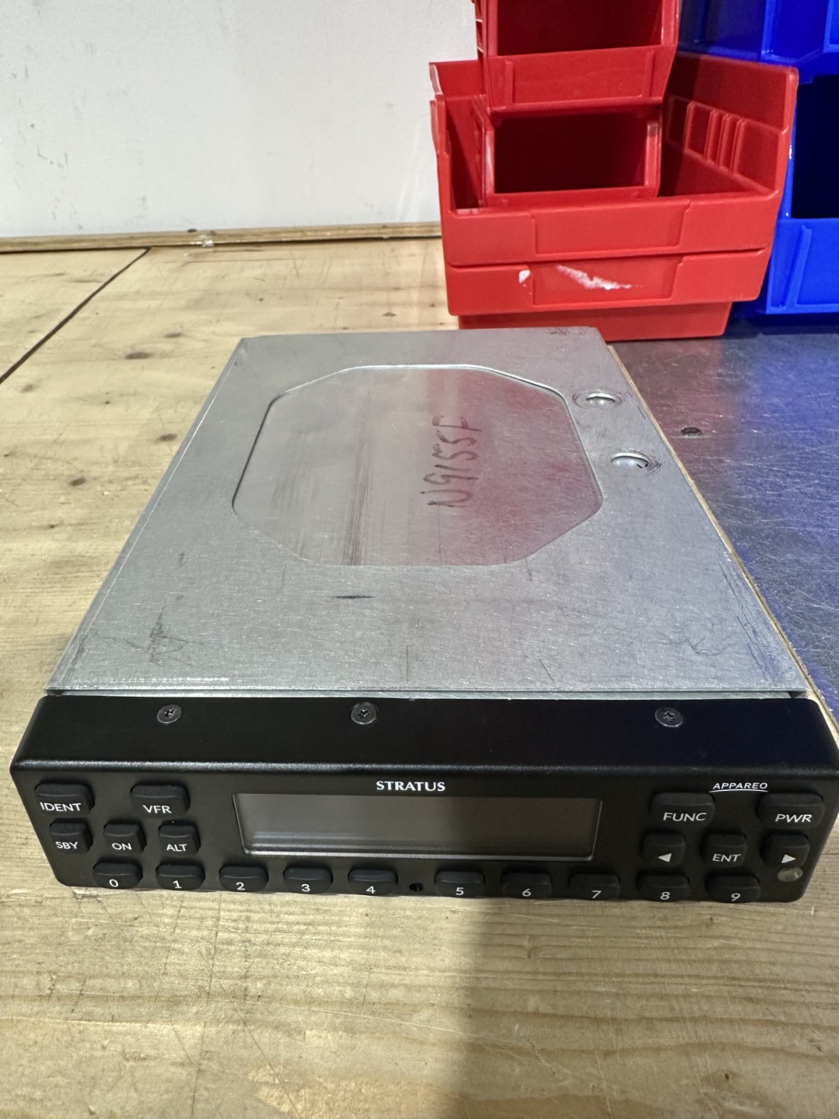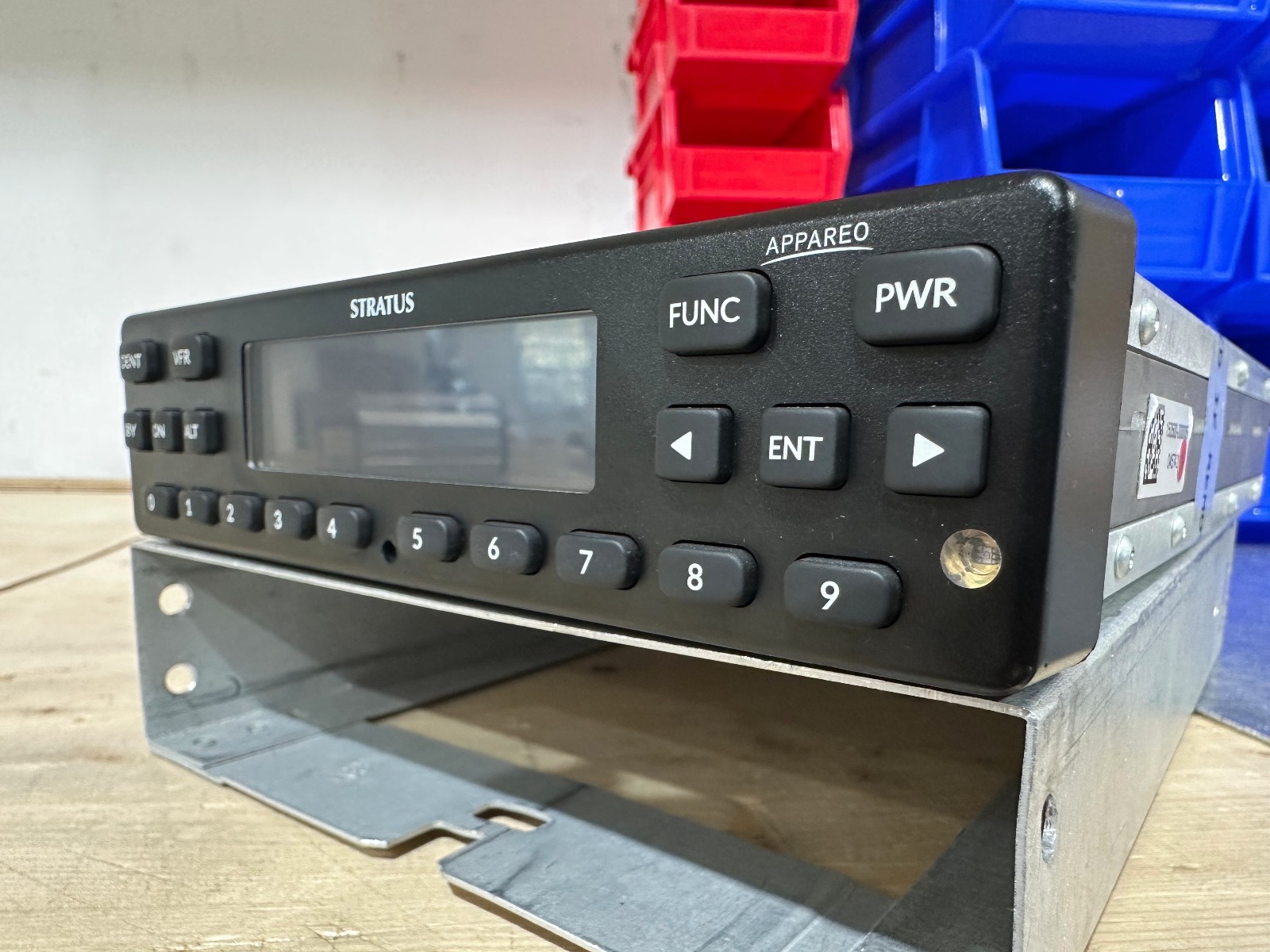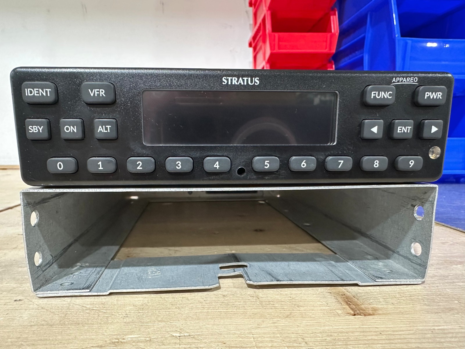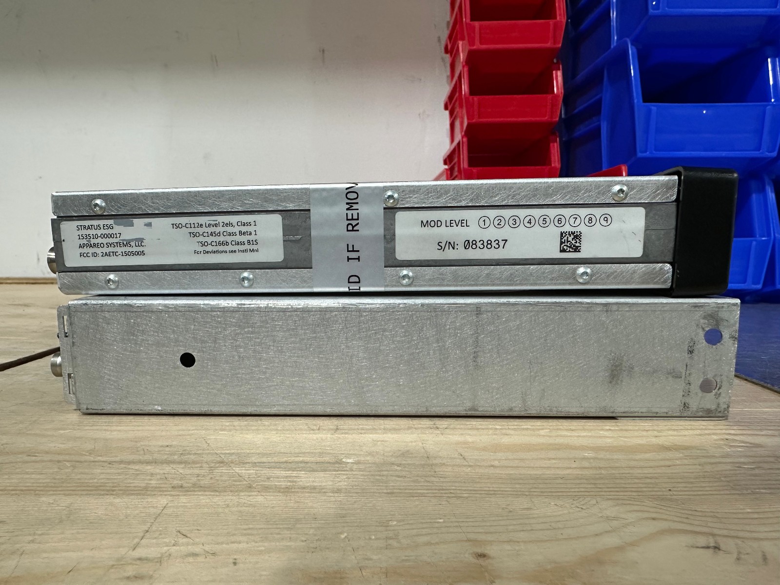 APPAREO STRATUS ESG TRANSPONDER. P/N 153510-000017. GREAT CONDITION. PLEASE SEE PICTURES. RACK WITH CONNECTOR INCLUDED. NO INSTALL PINS WILL BE SHIPPED. TAGGED WITH 8130 IN-HOUSE BY SARASOTA AVIONICS 12/AUG/2024.