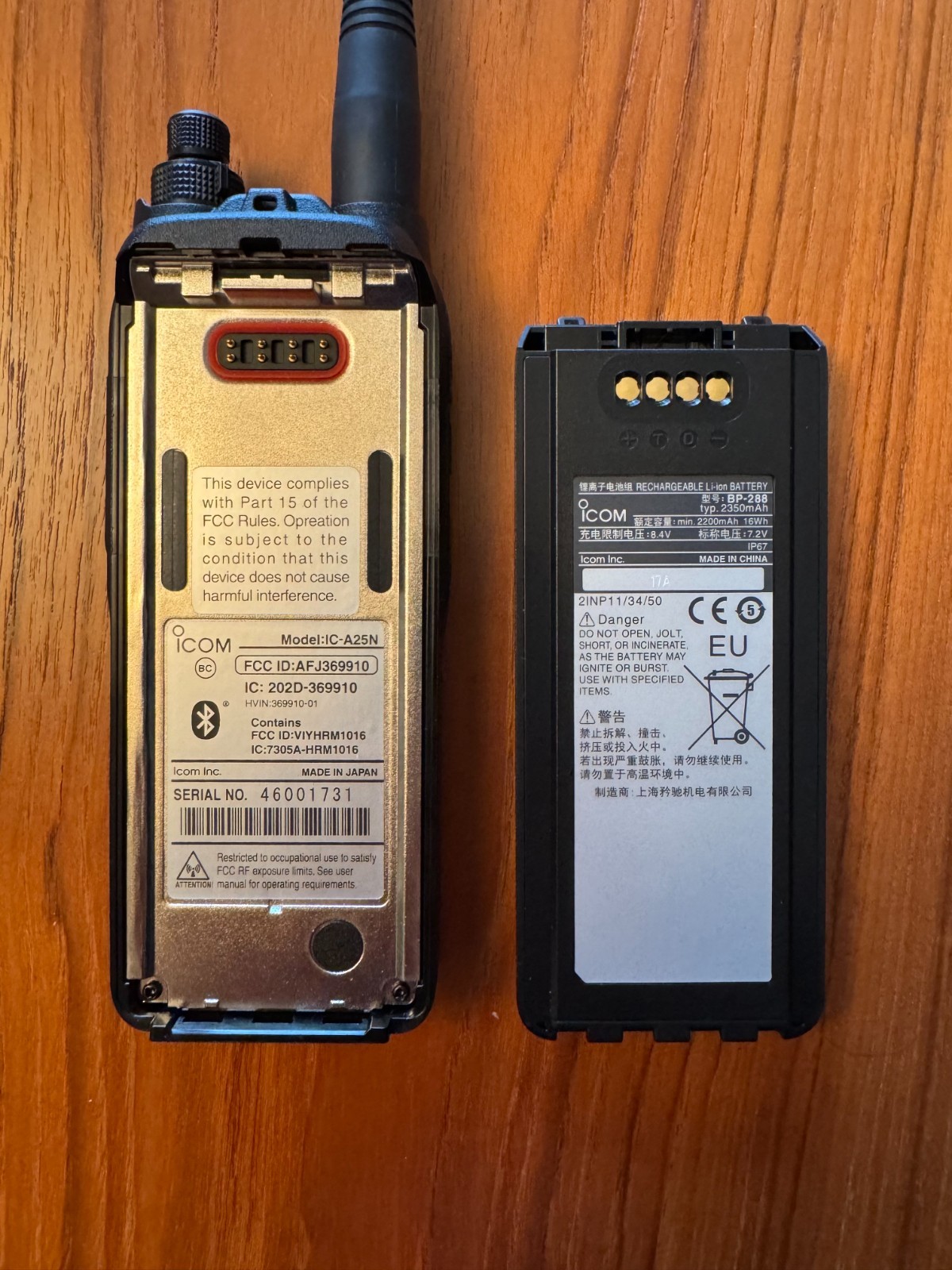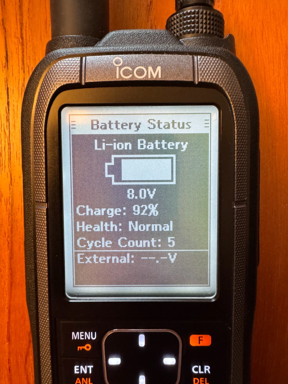 This is an Icom IC-A25N handheld transceiver in used-like-new condition. The unit has been lightly used and is fully functional with no issues. Battery shows normal health with approximately five charge cycles, providing reliable runtime comparable to new.