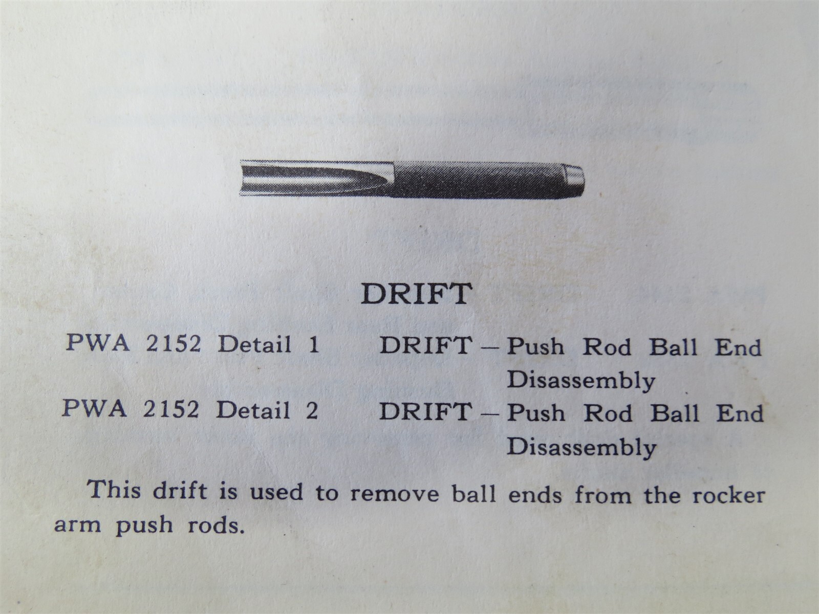 Pratt & Whitney PWA2152-D1 Drift Tool for Push Rod Ball End (Disassembly)in new surplus condition. According to July 1944 Pratt & Whitney Aircraft Tools Catalog (page 30), this special tool is used to remove the Ball Ends from the Rocker Arm Push Rods on R-985, R-1340 and R-1830 Series Engines.