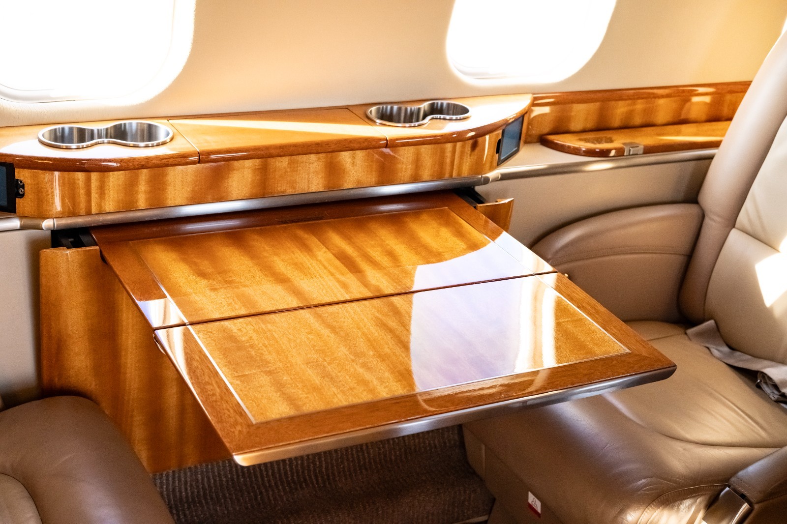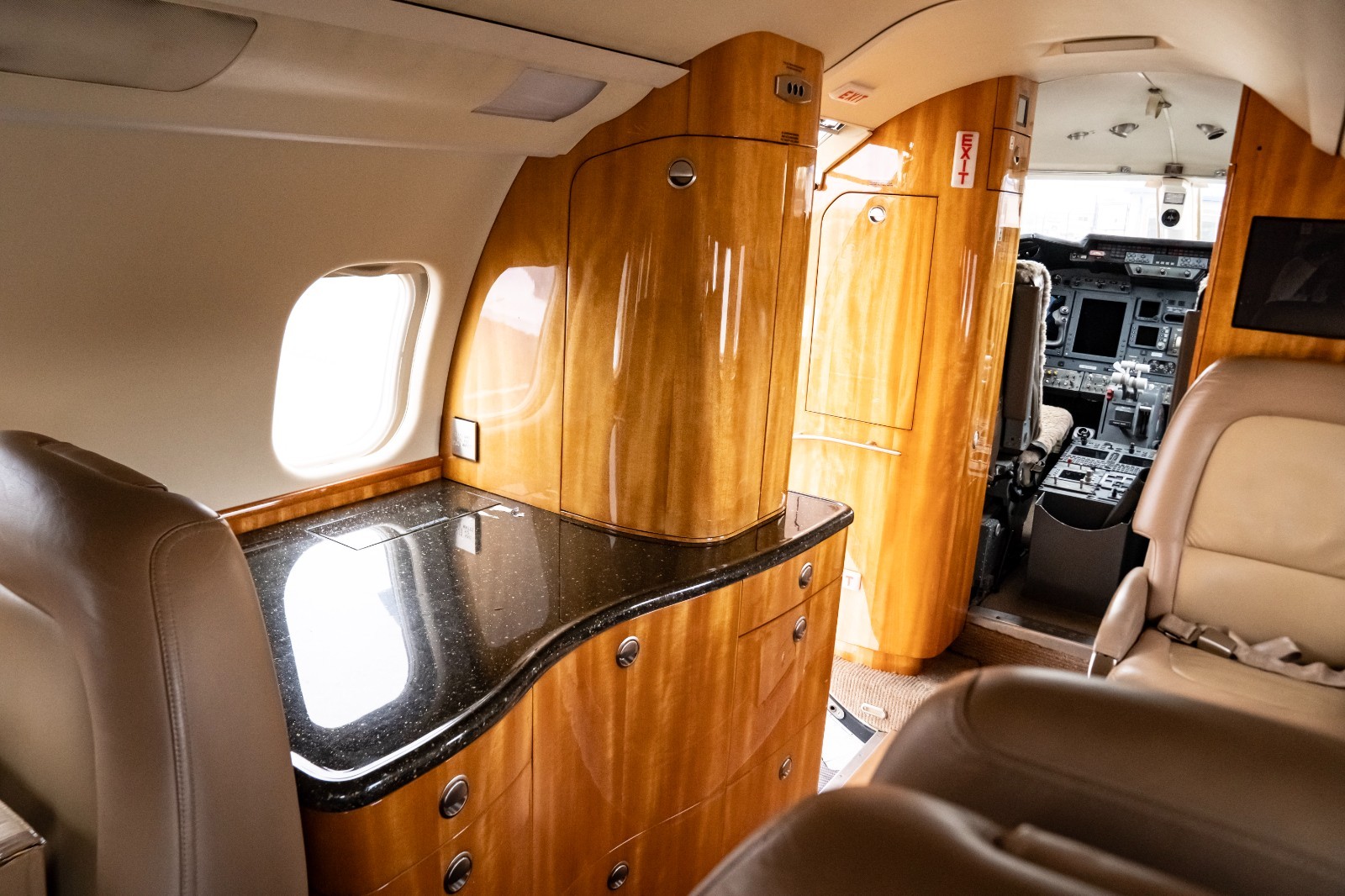 Forward refreshment center with microwave, hot liquids container, ice drawer, drink storage, waste bin, and more. LED cabin lighting, bulkhead monitors, and Airshow 410 system included.