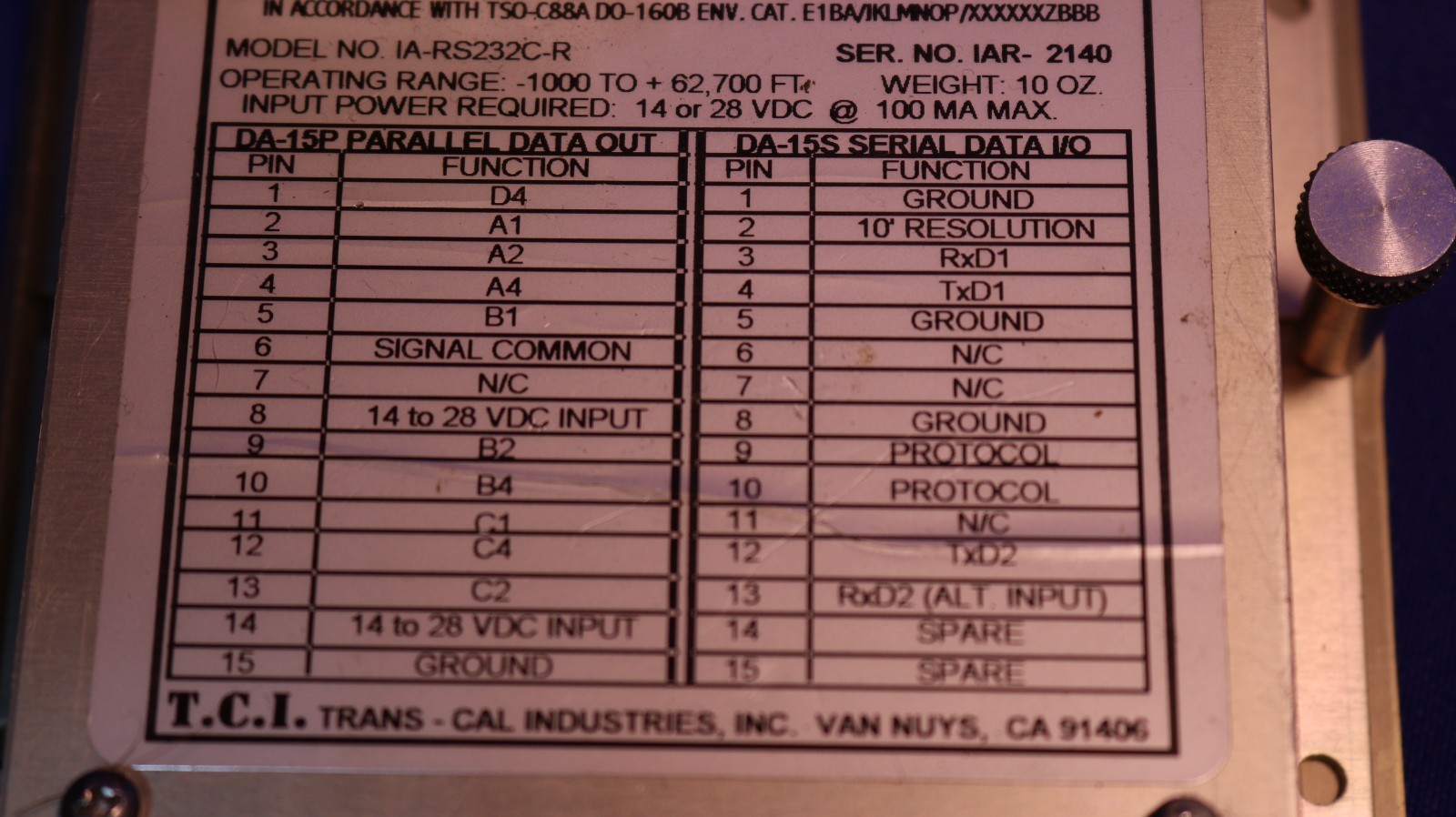 This is a TCI Remote Altitude Encoder Interface Adapter IA-RS232C-R, serial number IAR-2140. This item was removed during an installation project at our facility. This item is being sold "As Is" as we have no ability to bench check the unit. Sub this item for yours in a plug n play situation or use it for parts to repair a unit that is not functioning.