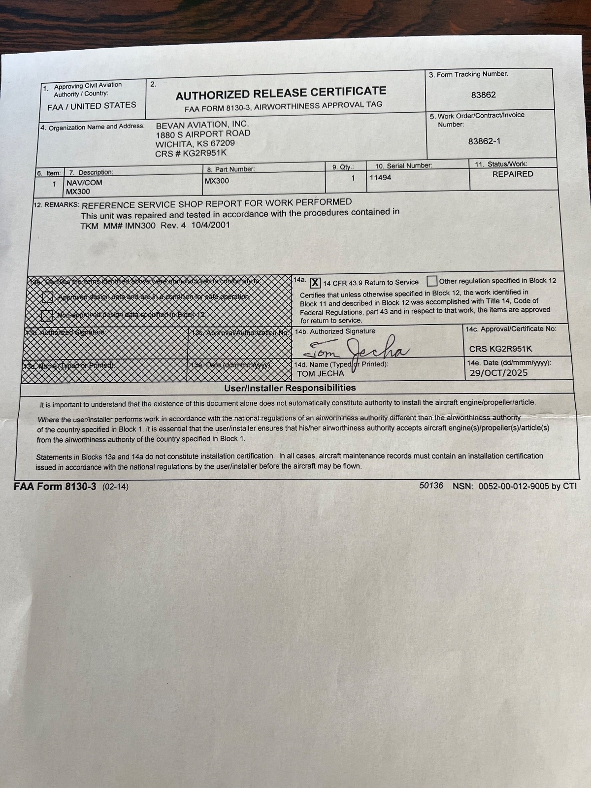 TKM MX 300 NAV/COMM 14V Serviced w/ FAA 8130-3 Form-90 day warranty