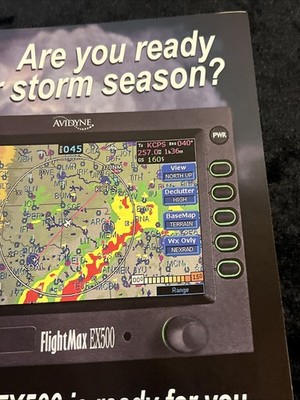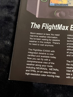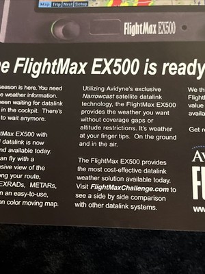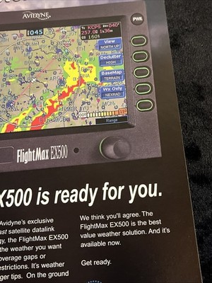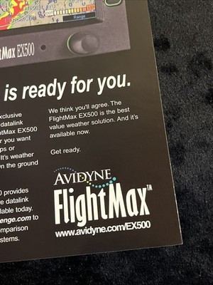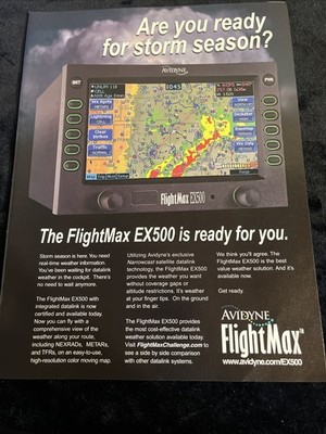 The product is an 8x10 magazine print advertisement for the Avidyne FlightMax EX 500, a line of aviation parts and accessories. The advertisement likely features information about the brand Avidyne and the FlightMax EX 500 product, showcasing its features and benefits for aviation enthusiasts and professionals. This collectible item serves as a promotional piece for Avidyne's aviation solutions and may be of interest to those in the aviation industry looking for quality and reliable products.