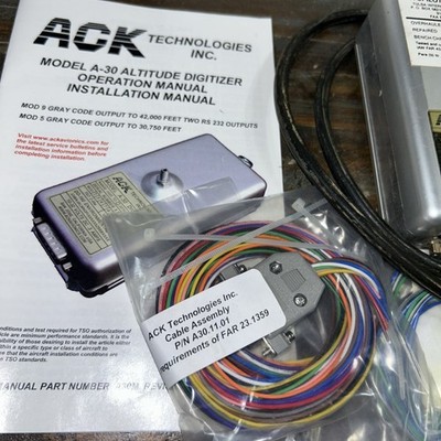 The ACK A-30 Encoder is a high-quality aviation part designed for avionics systems. With a maximum capacity of 30,000 encodings, this encoder includes all necessary wiring and tubing for easy installation. The manual provides detailed instructions for setup and operation, ensuring a smooth integration into your aircraft's avionics system. Manufactured by ACK, a trusted brand in aviation parts, the A-30 Encoder is a reliable and efficient component for your aircraft's transponder system.