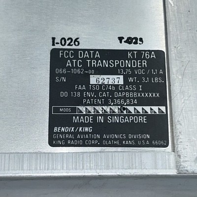 The King Transponder KT76A P/N 066-1062-00 is a high-quality avionics transponder manufactured by Bendix King in the United States. This product is specifically designed for compatibility with Avionics systems and comes with a manufacturer part number of 066-1062-00. While it does not come with a warranty, customers can rely on the reputation and expertise of Bendix King to deliver a dependable and reliable aviation part for their aircraft.