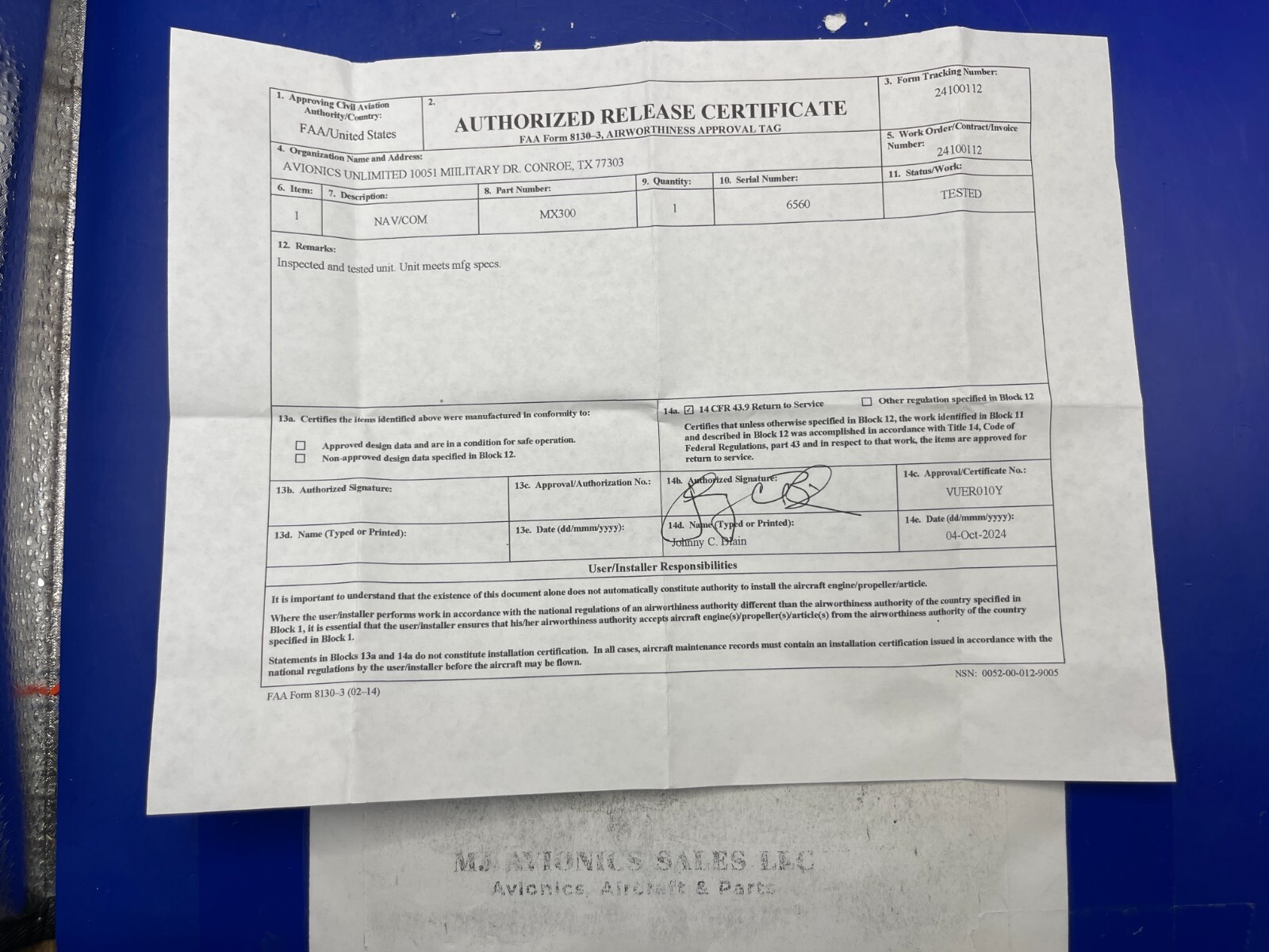 TKM MX 300 P/N MX300 S/N 6560 NAV/COMM TRANSCEIVER 14 VDC. COME WITH FAA FORM 8130-3 DATED 10/04/2024