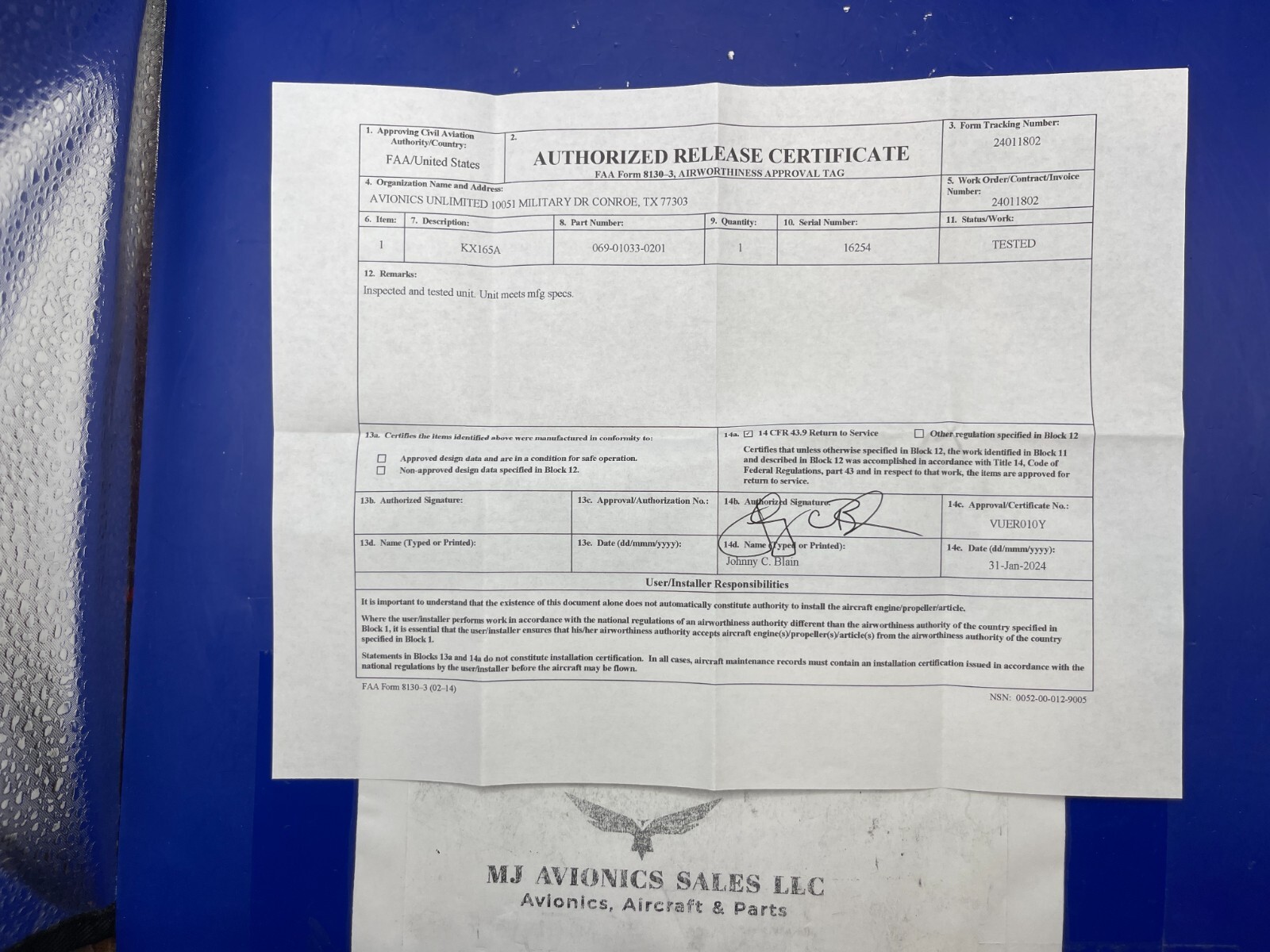 BENDIX/KING KX 165A 28 VDC P/N 069-01033-0201 S/N 16254 WITH GLIDESLOPE COME WITH FAA FORM 8130-3 DATED 01/31/2024 THIS UNIT NEVER BEEN INSTALLED SINCE BEEN BENCH CHECK.