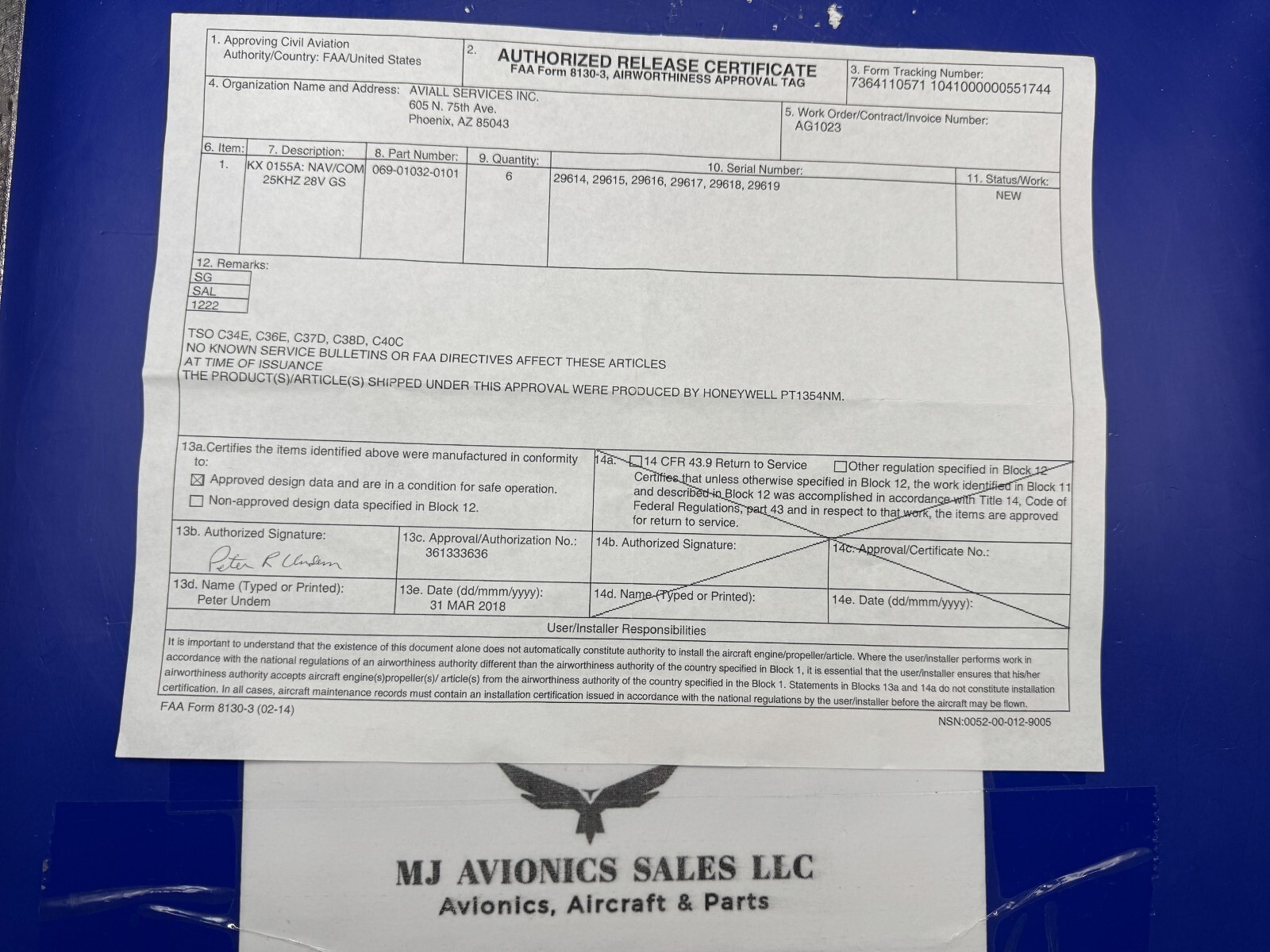 NEW BENDIX/KING KX 155A 28 VDC WITH LED DISPLAY P/N 069-01032-0101 S/N 29615 WITH GLIDE/SLOPE COME WITH FAA FORM 8130-3 DATED 03/18/2018 THIS UNIT NEVER BEEN INSTALLED SINCE BEEN BENCH CHECK.