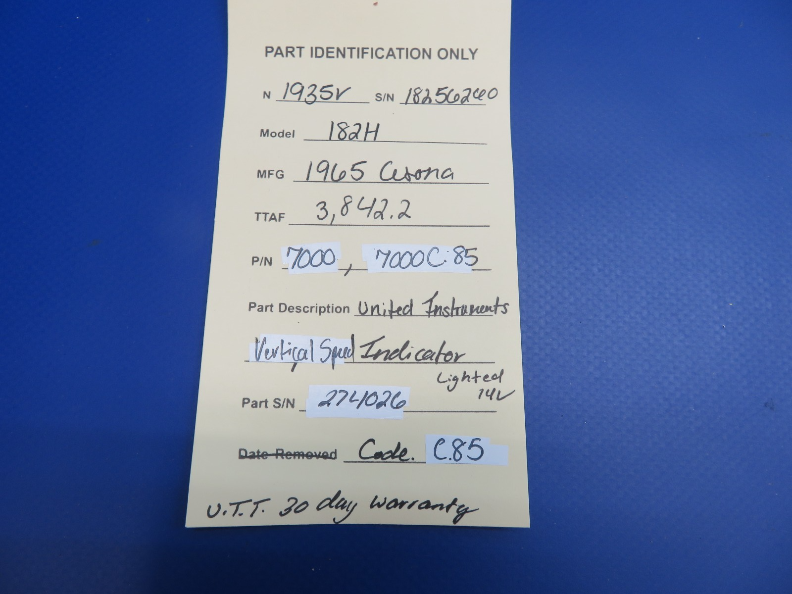 Cessna 182 / 182H United Instruments Vertical Speed Indicator. Lighted 14 Volts. P/N 7000, 7000C.85. Code C.85. S/N 274026. We are unable to test this unit, however, we are selling this unit with a 30 day warranty. Removed in good condition from a 1965 Cessna 182H N1935V, S/N 18256260. TTAF 3,842.2. Guaranteed to pass inspection or your money back.