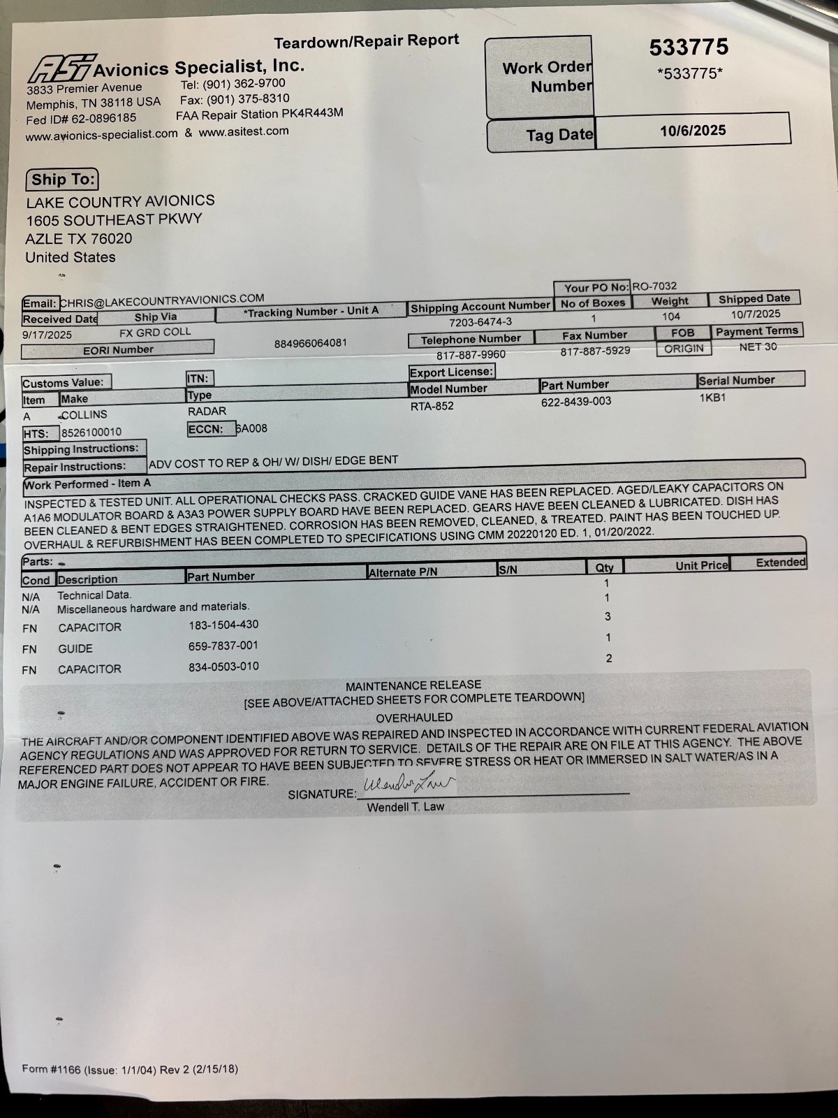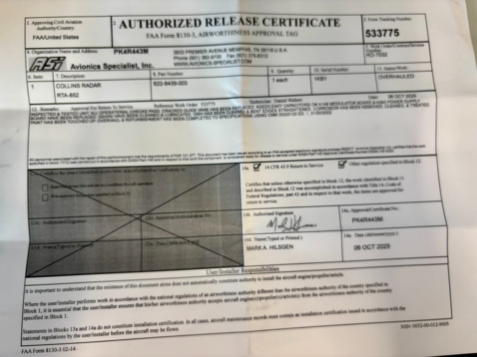 Radar Antenna RTA852 622-8439-003 w/ October 2025 Overhauled 8130Click here to purchase or contact the seller of this item on eBay |