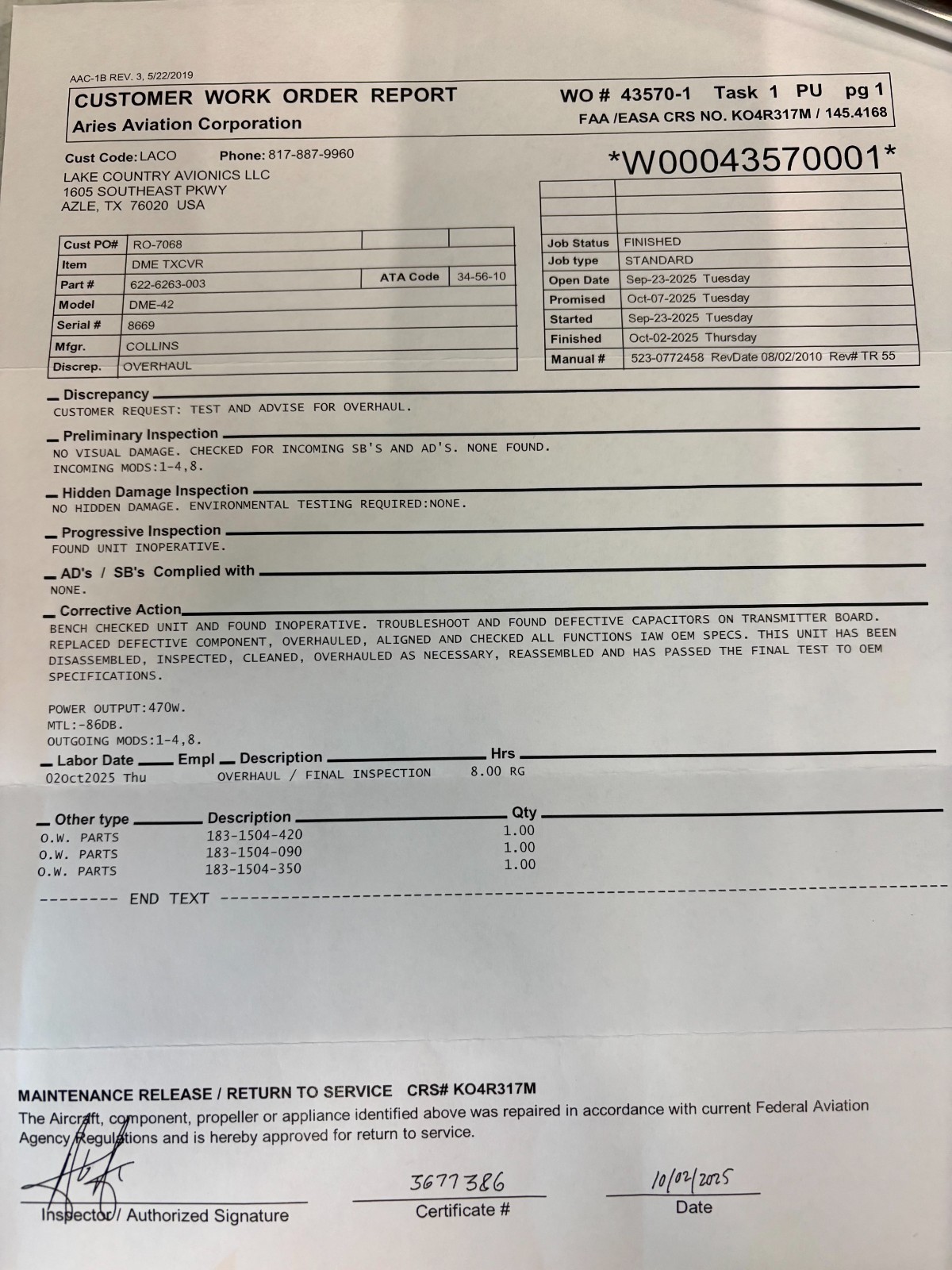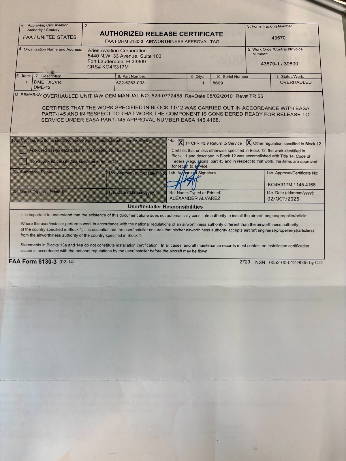 DME Transceiver DME42 622-6263-003 w/ October 2025 Overhauled 8130Click here to purchase or contact the seller of this item on eBay |