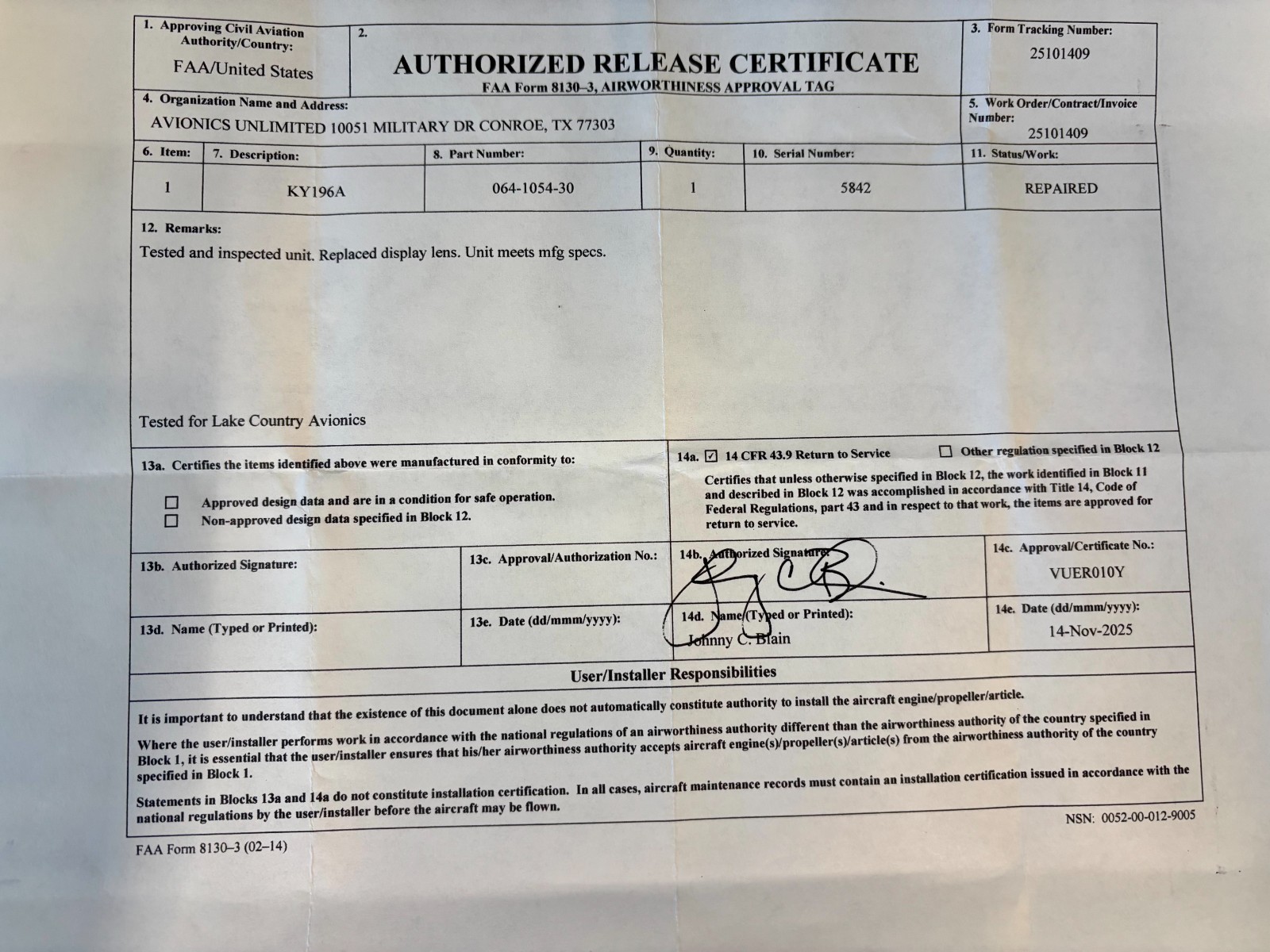 VHF Comm Transceiver KY196A 064-1054-30 w/ November 2025 Repaired 8130Click here to purchase or contact the seller of this item on eBay |