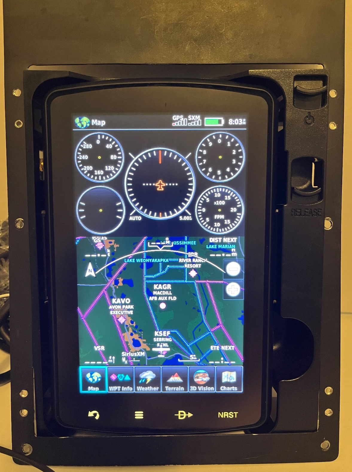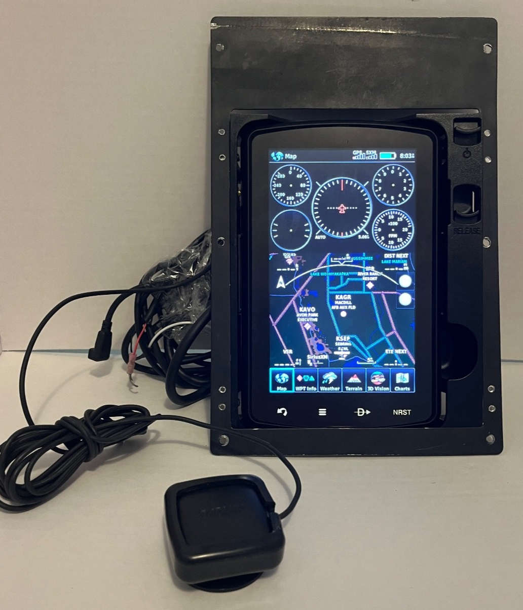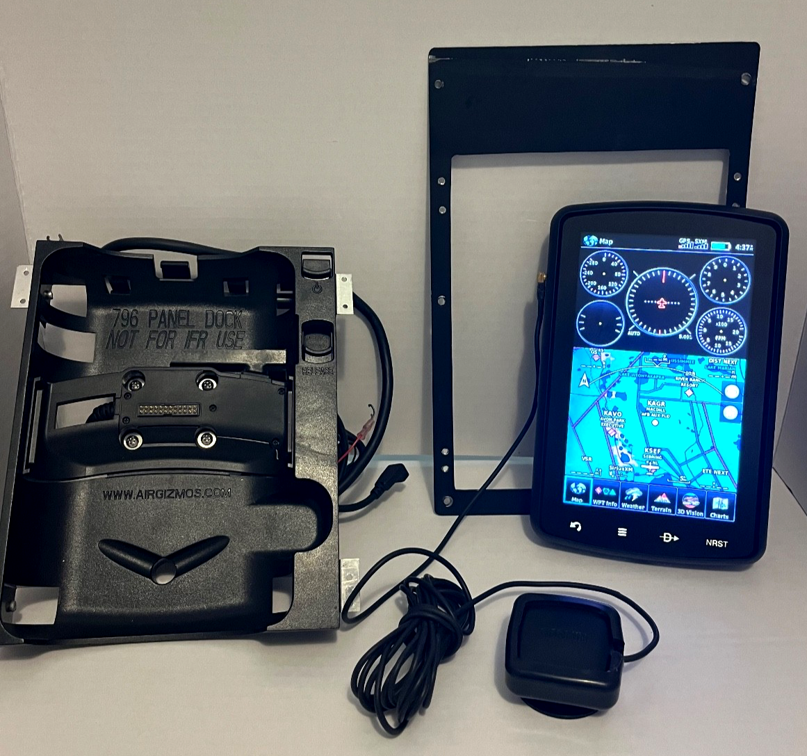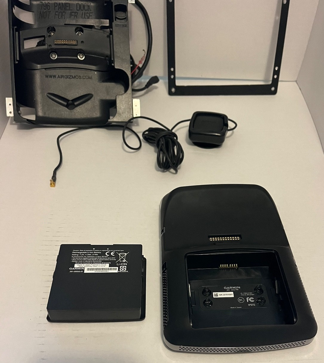 This Garmin Aera 796 GPS was removed from an avionics upgrade and works as it should. The unit comes with a Gizmo panel mount system with modified wiring harness. A Rechargeable Li-Ion Battery. GPS Antenna with suction mount and an aluminum instrument filler overlay panel. This unit is used and showed some ware, display has a light clouding that may be removed with a light cleaning. (See Pictures for more details)