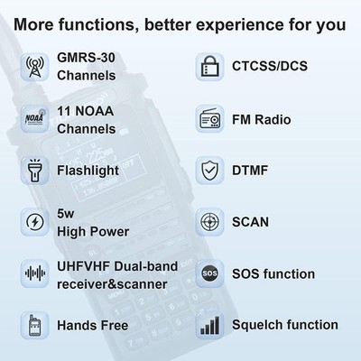 - 【NOTICE】 1-The amount of electricity will affect the power. Email us and get a solution of TX power. 2-Bluetooth Problem: Press BL button to restart Bluetooth. 3-On the GMRS mode, VFO mode cannot Transmit. Some channels are not editable, see more on Q&A and Product Description. 4- Battery problems or missing parts, please contact us.