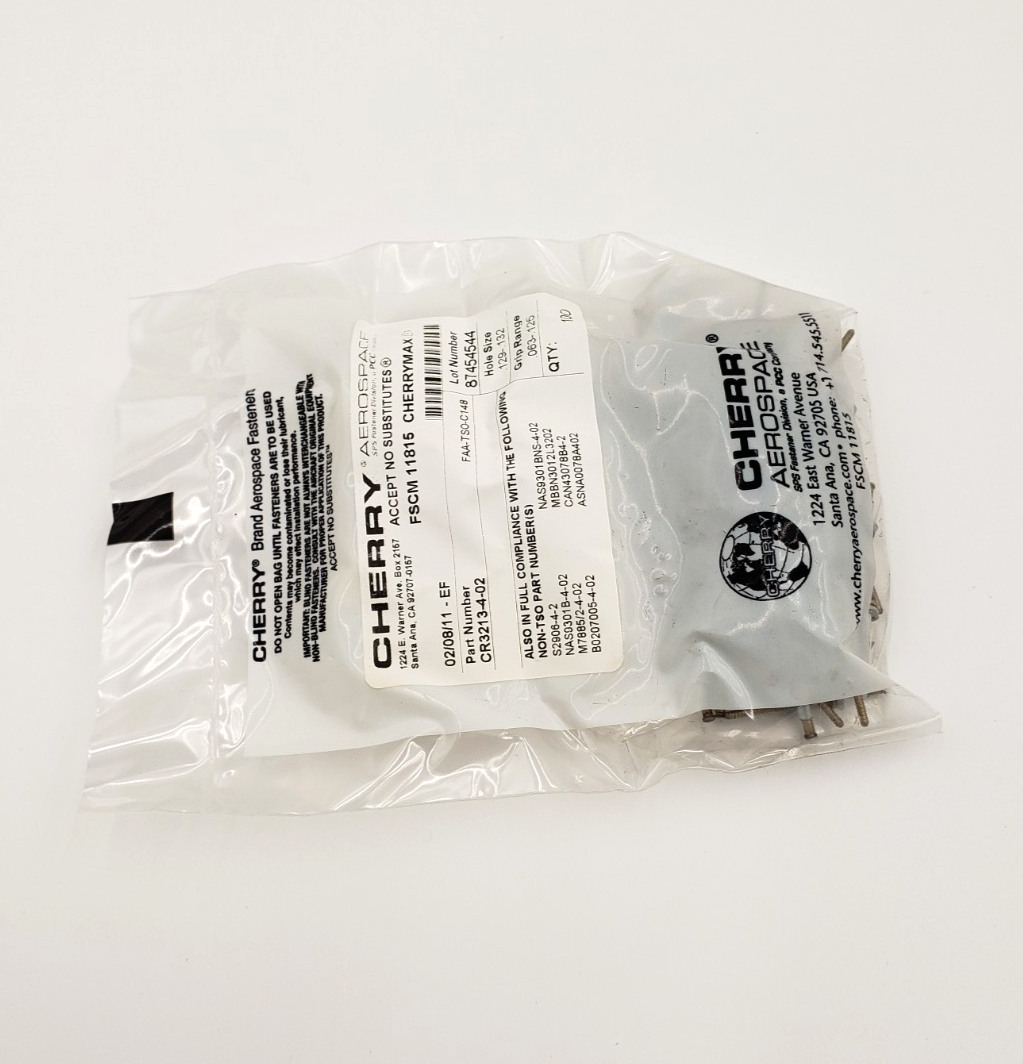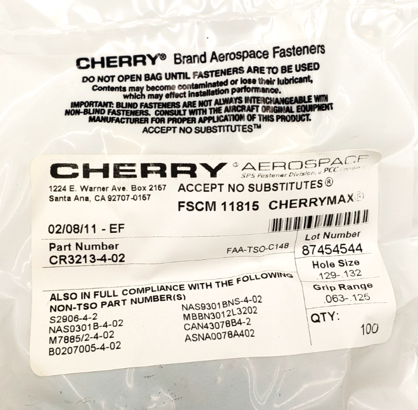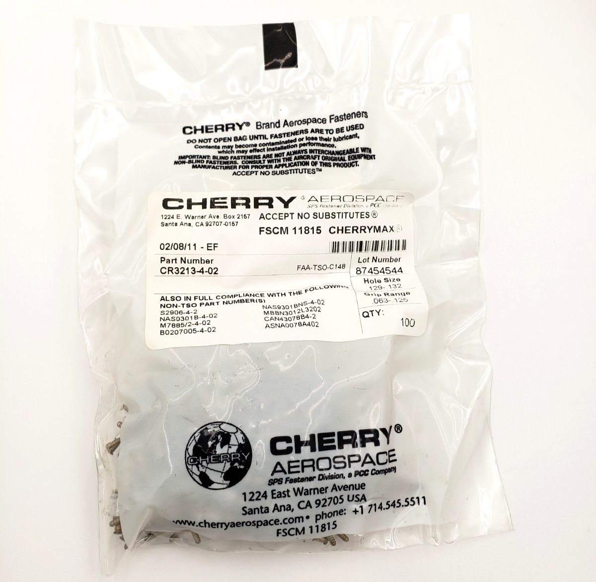 New Bag of 100 Cherry Aerospace CherryMAX CR3213-4-02 Universal Head Blind Rivet Fasteners Sealed