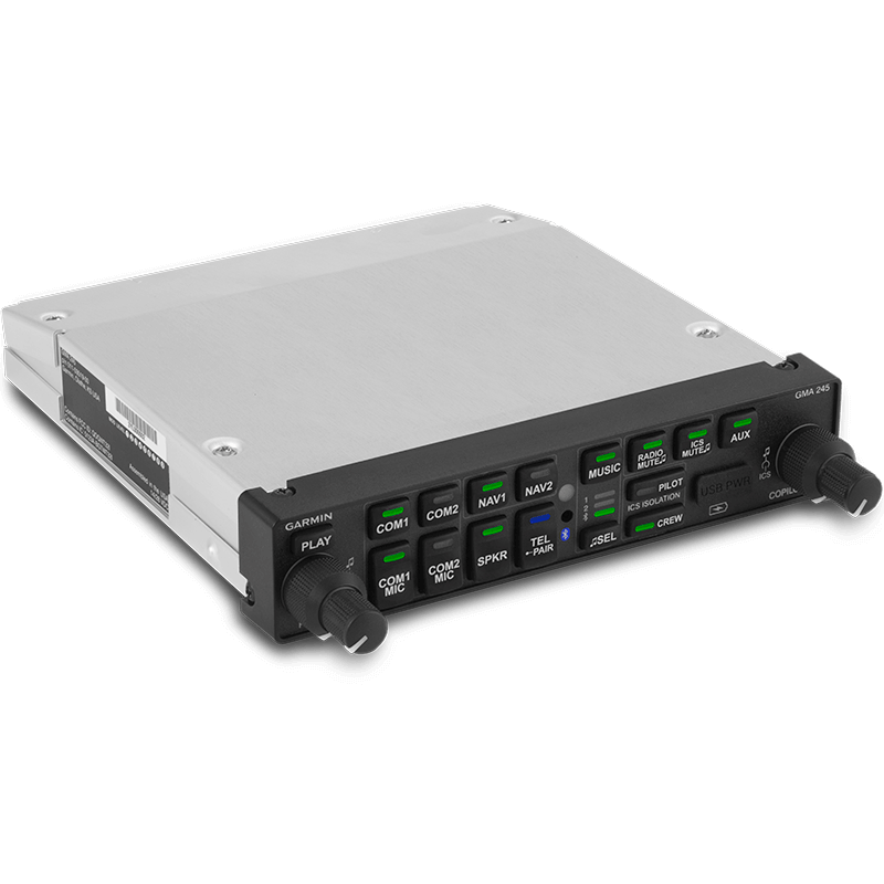 Featuring Bluetooth wireless connectivity, 3D Audio processing, clearance playback and impressive audio mixing and distribution, the GMA 245 audio panel represents the most advanced audio control technology Garmin has ever introduced for experimental amateur-built (EAB) and light sport aircraft (LSA) cockpits. Upgrading from the popular GMA 240 and GMA 340 audio panels in experimental aircraft has never been easier; simply slide in and fly away with the most modern audio processing capabilities available.