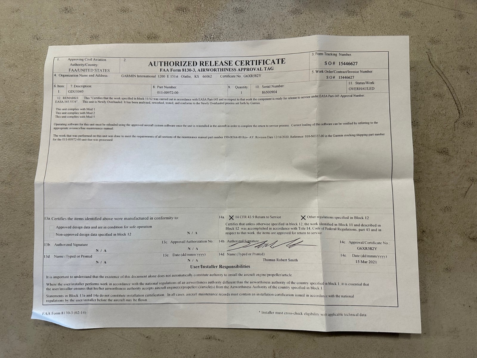 Garmin Newly Overhauled GDU 1040 PN: 011-00972-00. Purchased direct from Garmin but never installed. Display unit only, no SD cards. Unit will require appropriate software download at time of install (See notes on 8130).